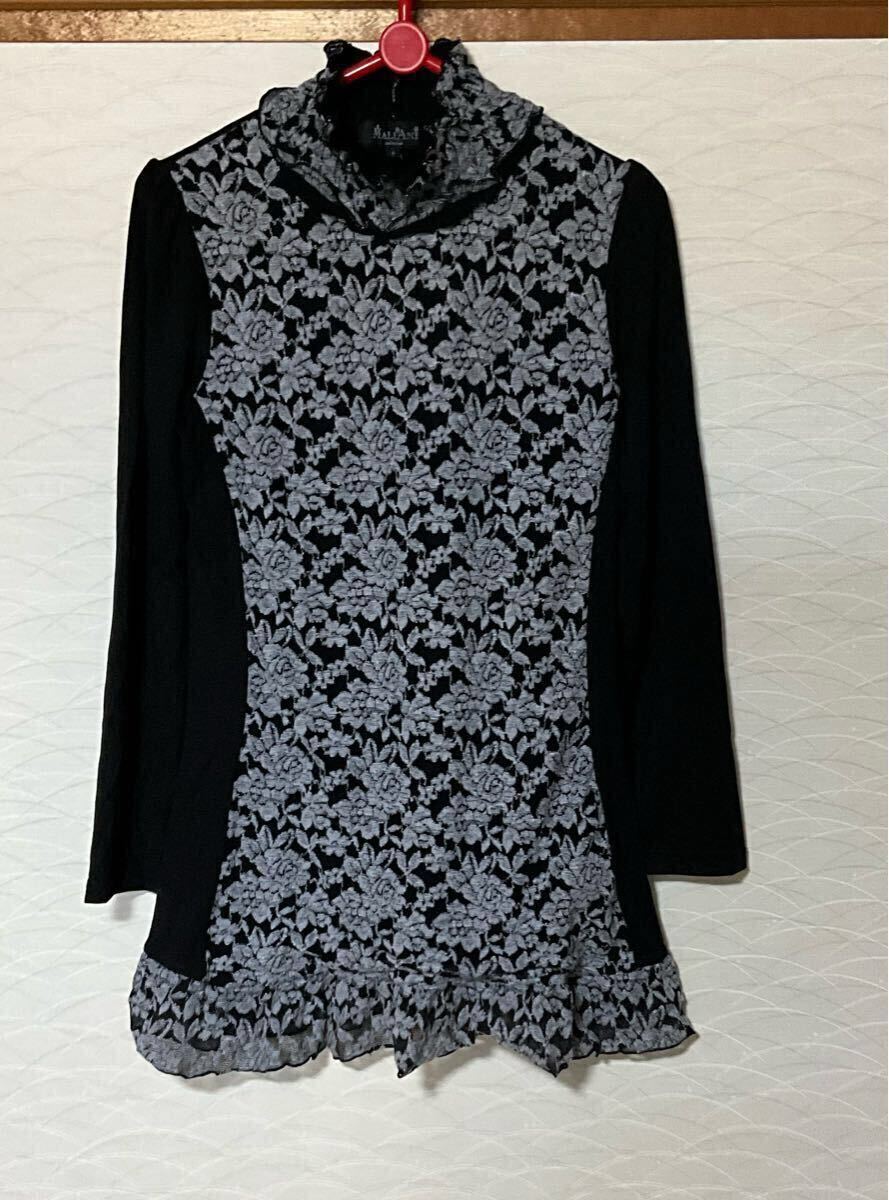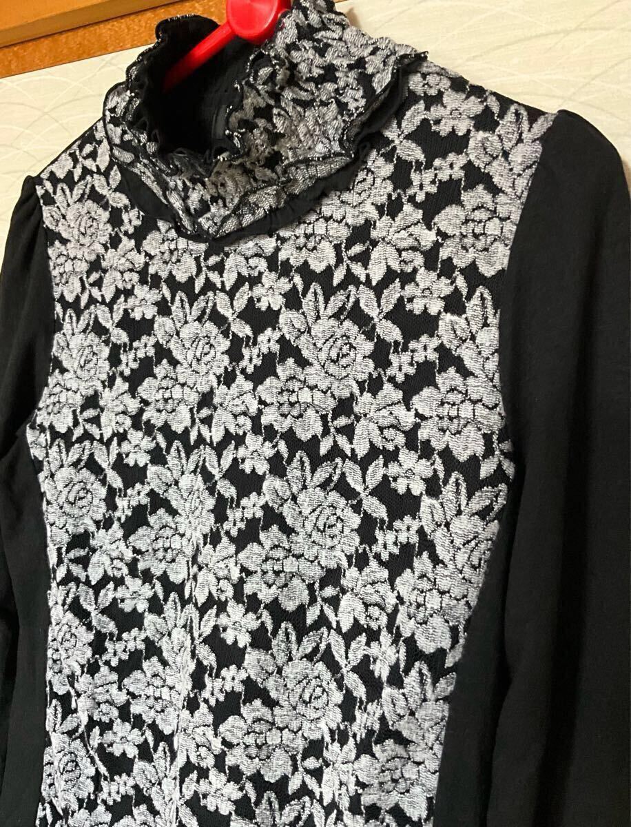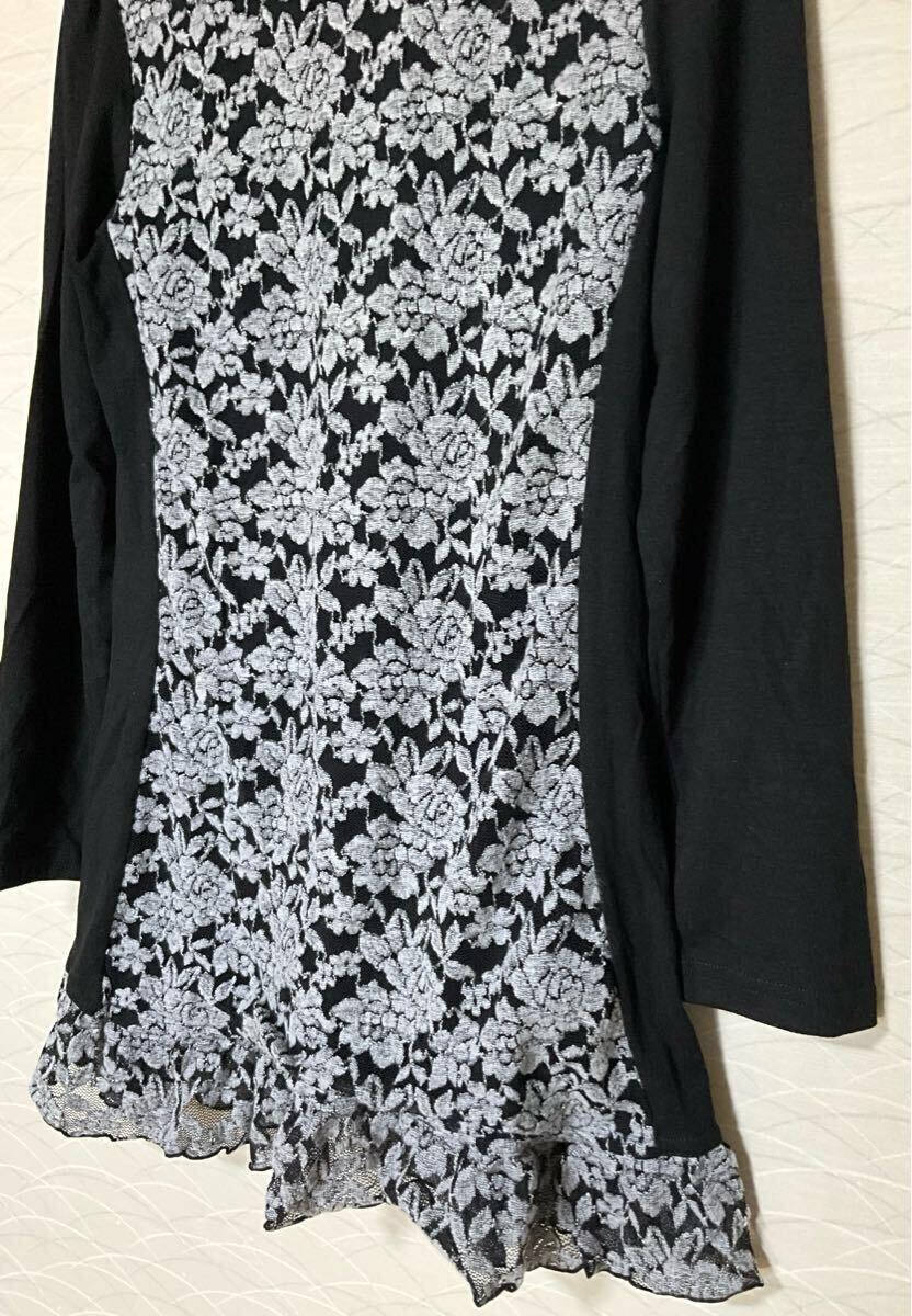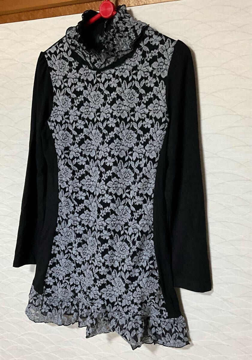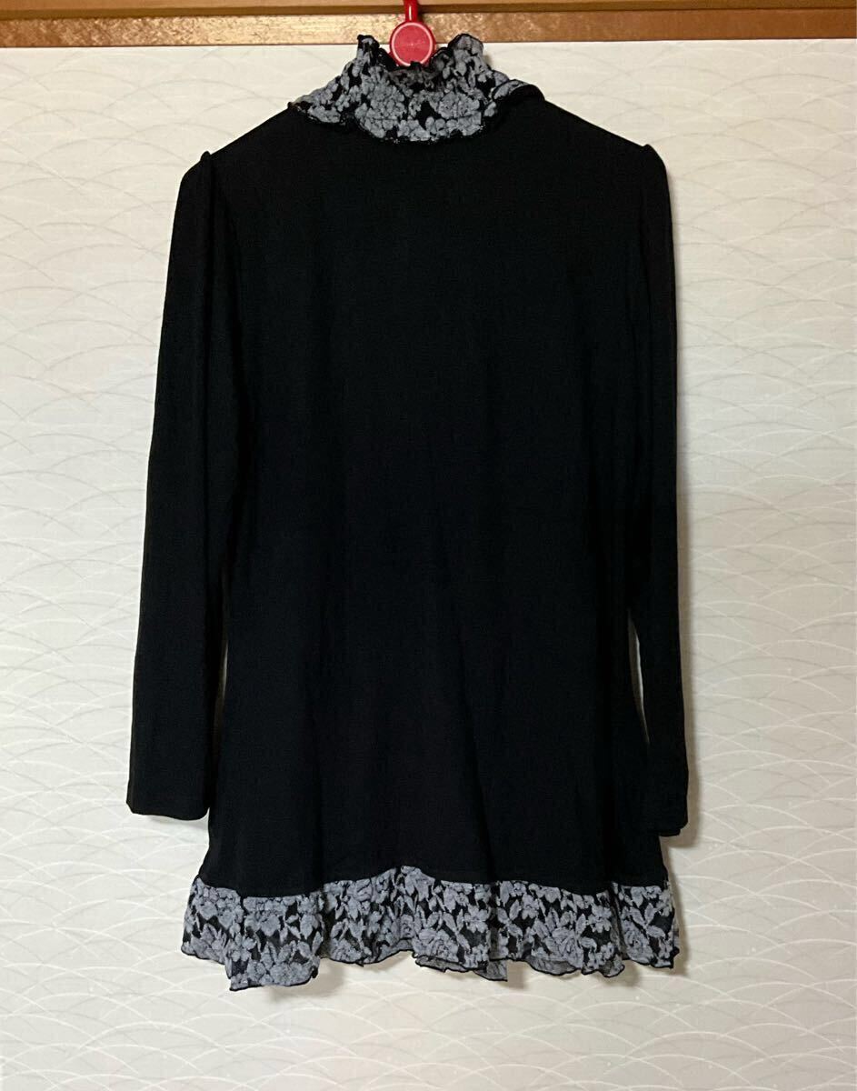 ハイネックチュニック ブラック 前身ごろ花柄レース/ブラック裏地 裾レースフリル ネック部分はゴムシャーリングのため着脱しやすいです 9号 着丈約70cm ポリエステル62%、レーヨン34%、ポリウレタン4%/前身ごろの裏地も同じ