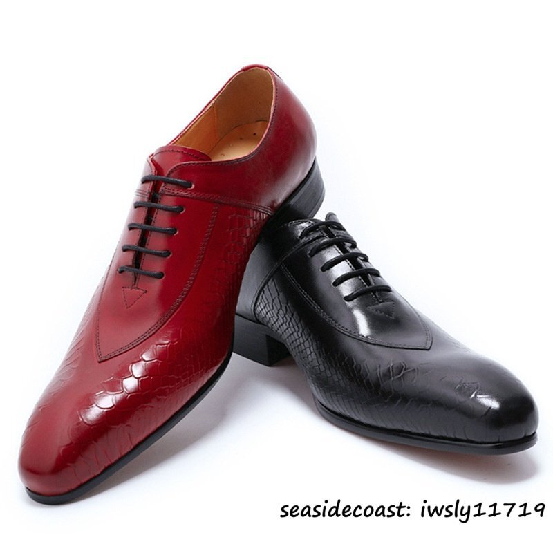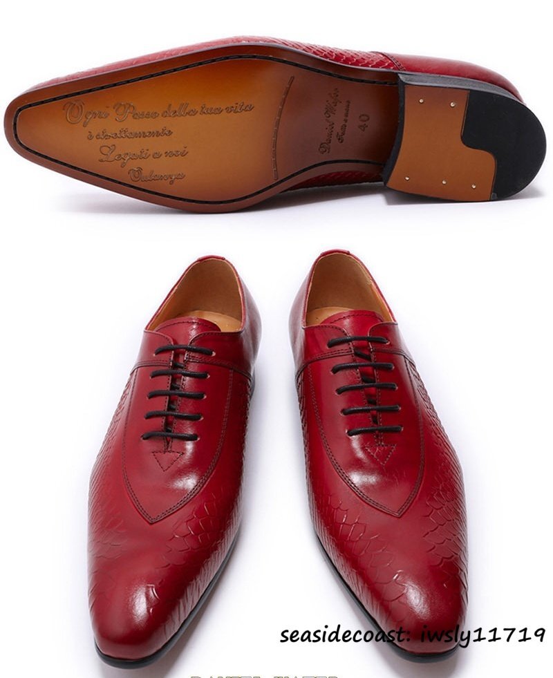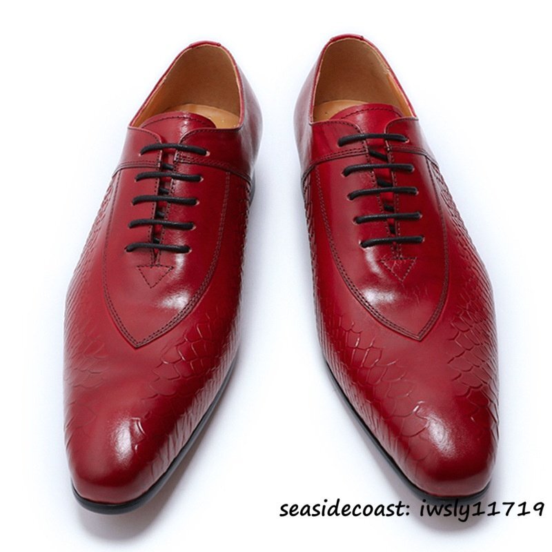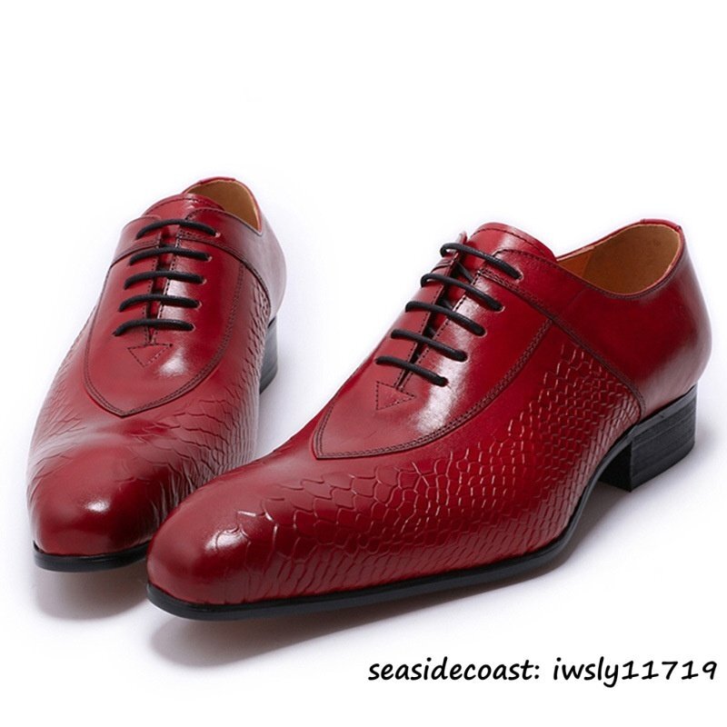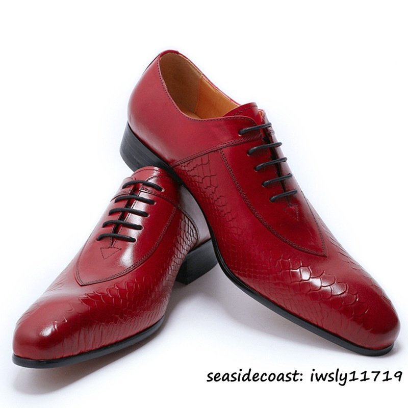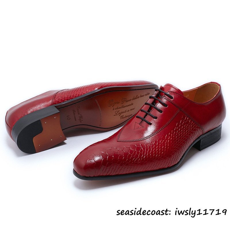 定価9万超◆超希少 牛革 ビジネスシューズ 蛇柄 メンズ 紳士靴 職人手作り 本革 レザーシューズ 革靴 最上級 フォーマル レッド 24.5cm