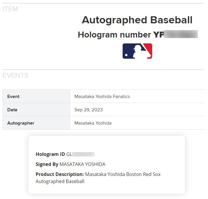 サインは、2023年9月29日にMLB機構立会いのもと、吉田選手と独占メモラビリア契約を結んでいる世界大手メモラビリア会社FANATICS社のサイン会でされたものです。サインを証明するFANATICS社とMLB機構のホログラムが貼ってあります。
