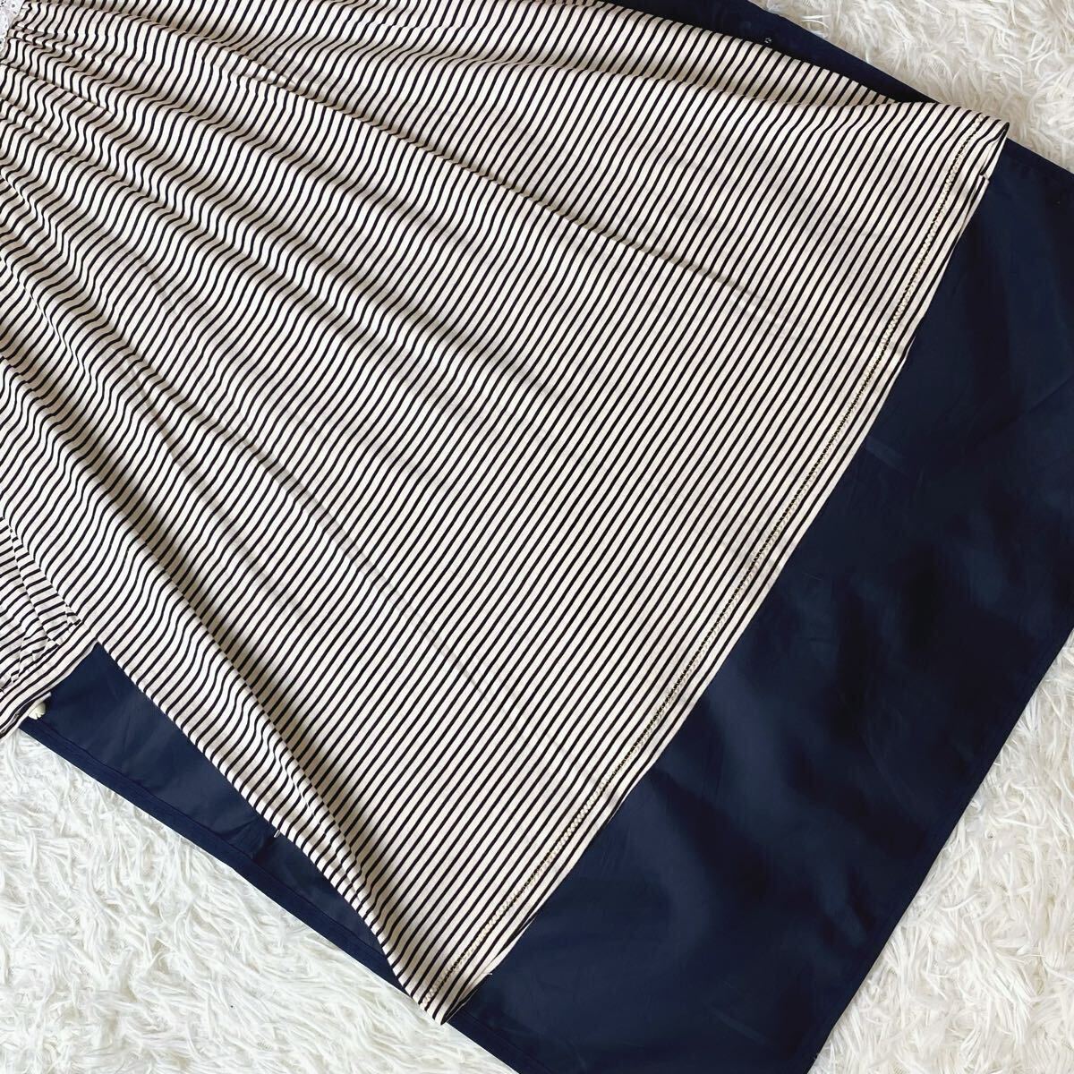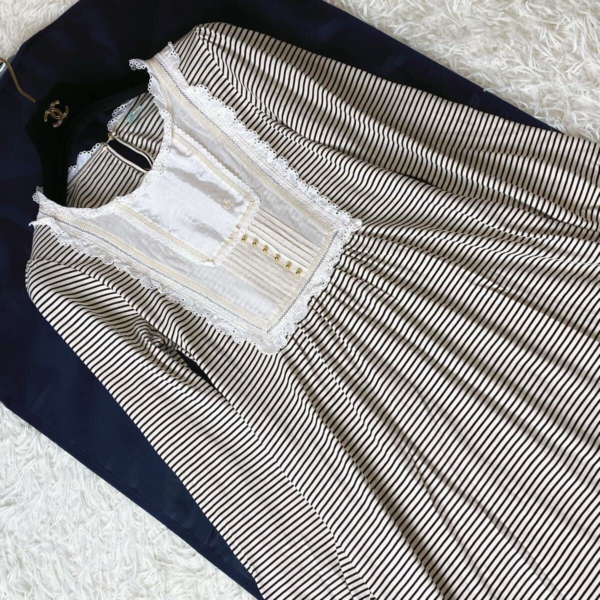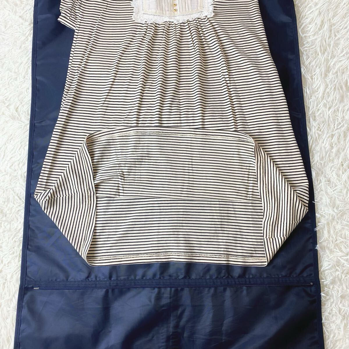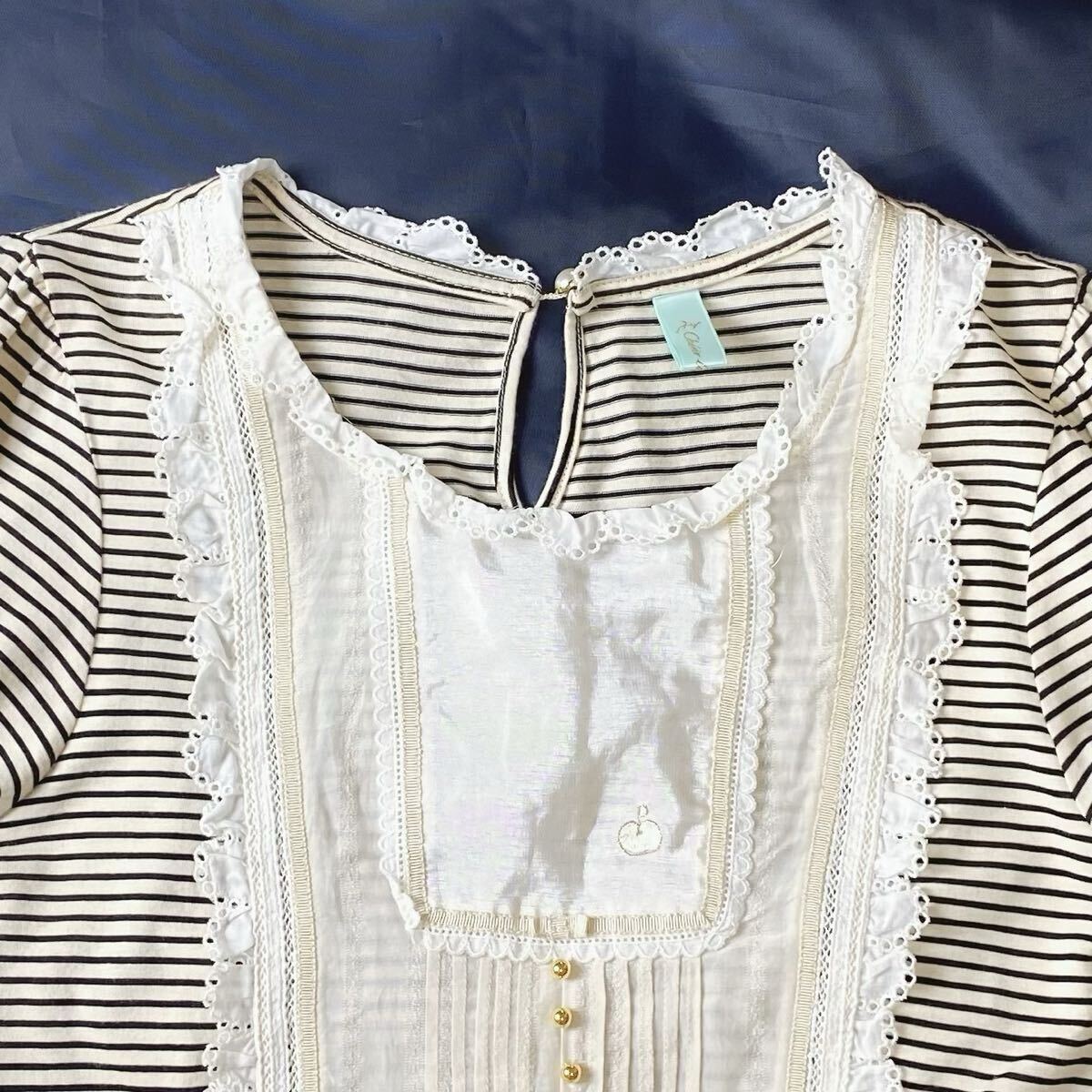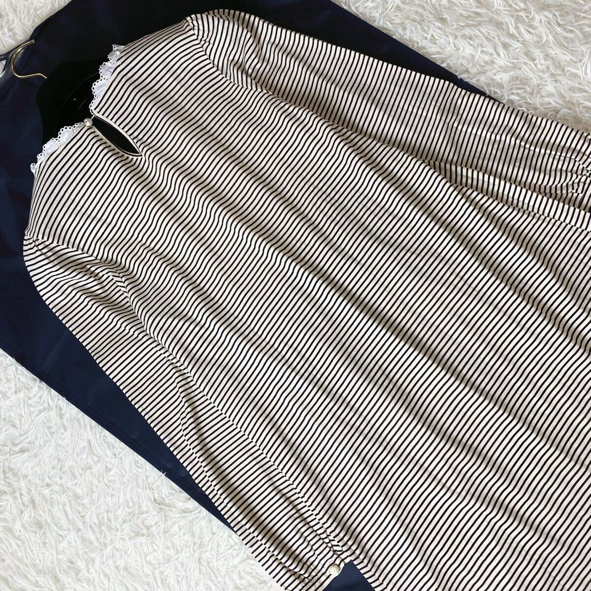 長袖 ボーダー フリル レース タック ロング ワンピース
