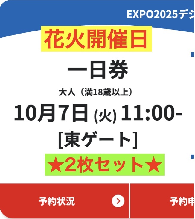!!!予約済!!!関西万博入場チケット★大人一日券10月7日(火)11:00〜東ゲート10/7(火)11時〜★2枚セット!