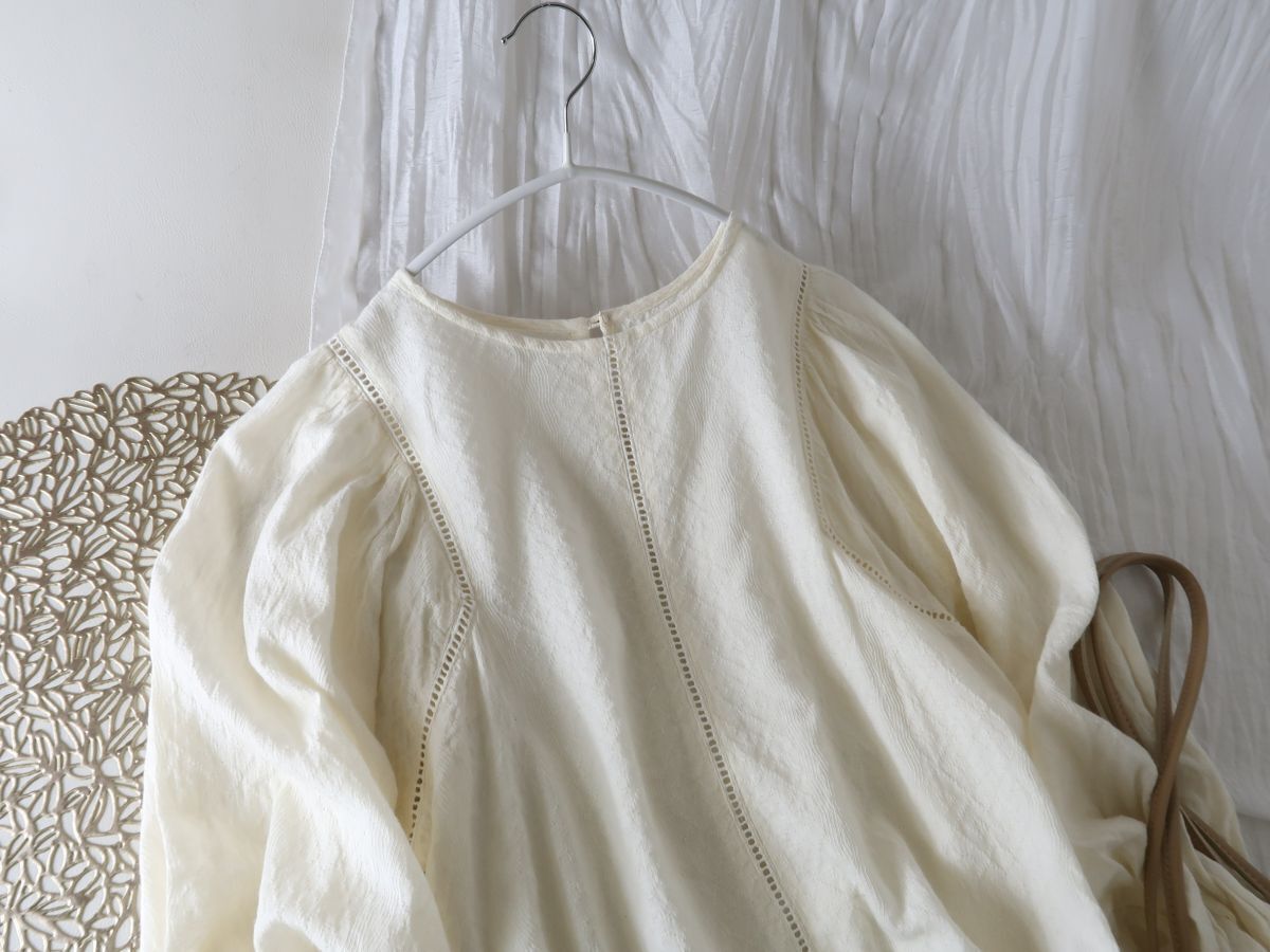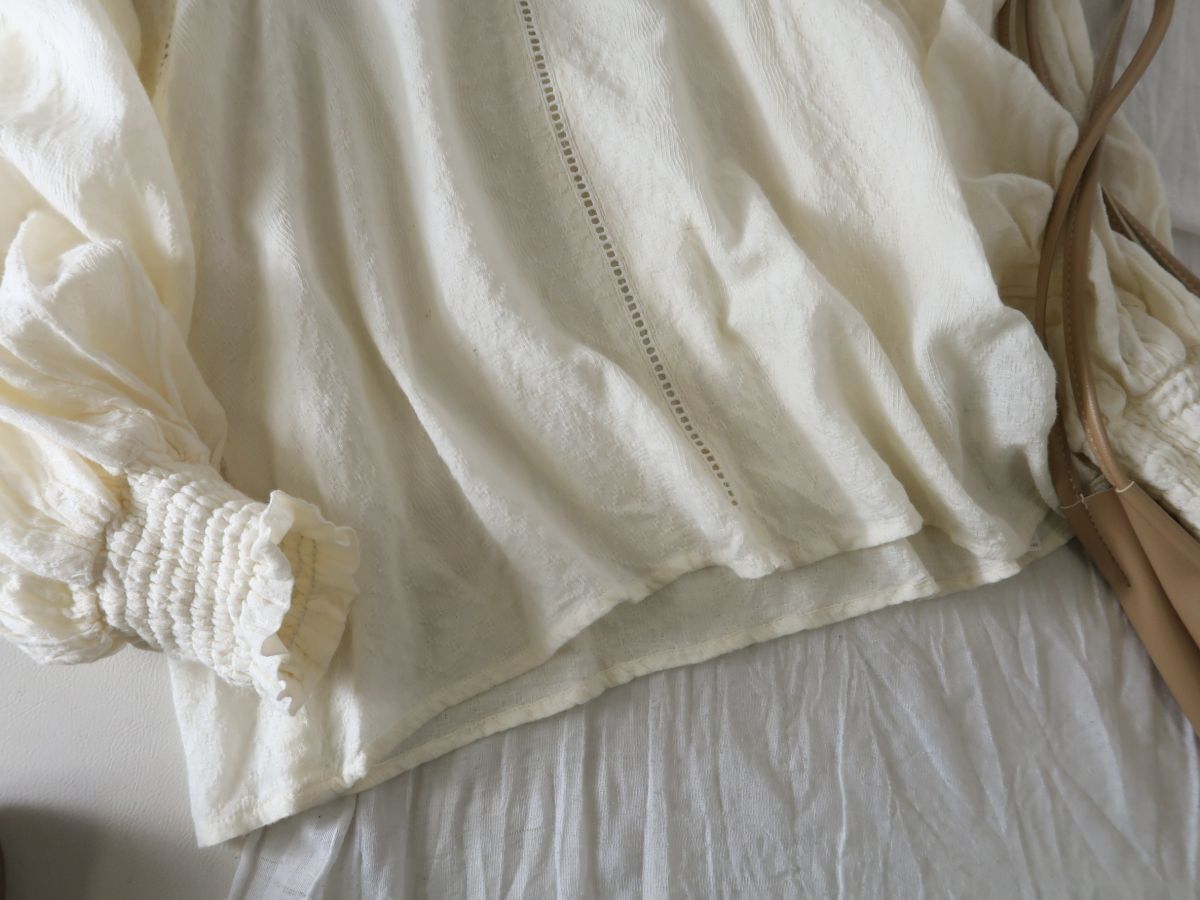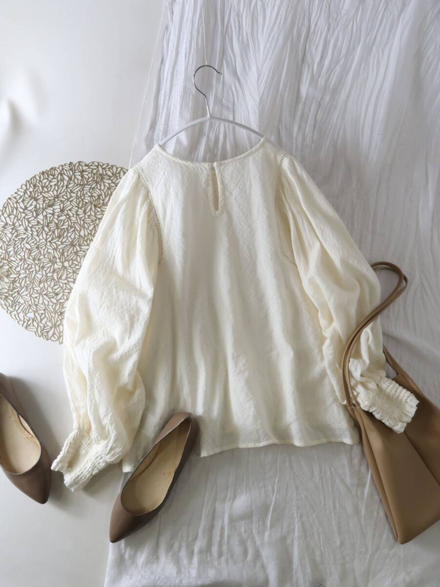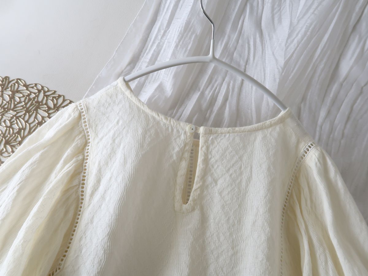 パフスリーブが愛らしいジャガード織のコットンブラウス。