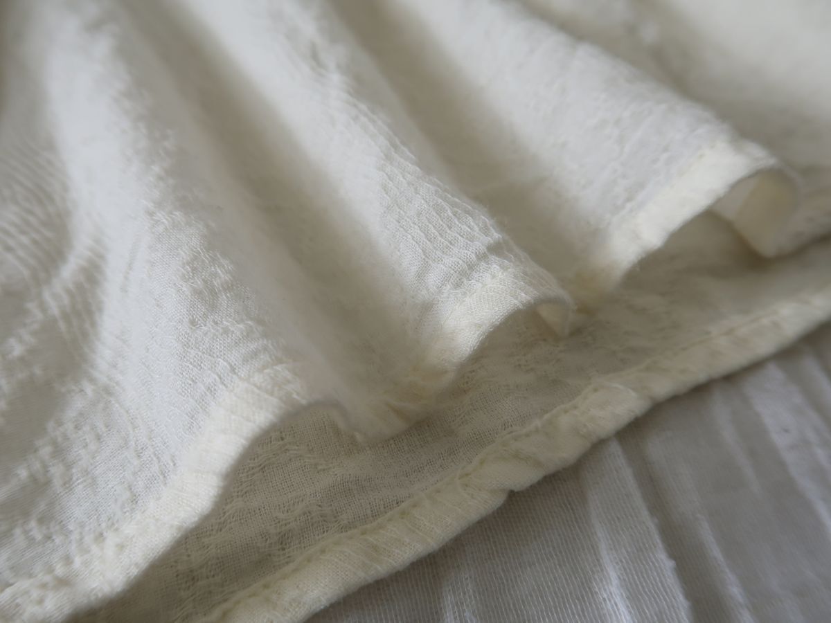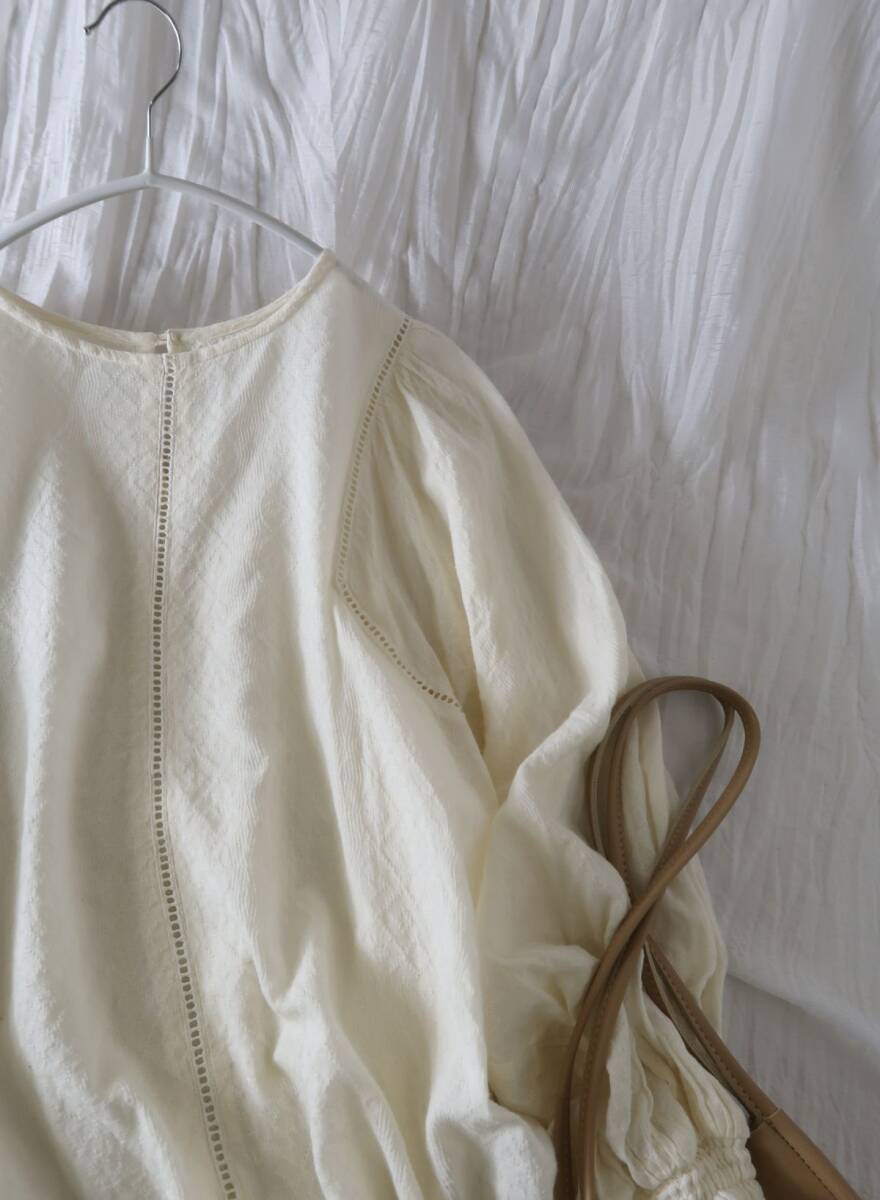 湿気に強く通気性に優れたインド綿を、ジャガード織りにし模様を施した素材が特徴のブラウス。 表面感がある素材のためしわが気になりづらいのも嬉しいポイント。 肌離れの良いエアリーなコットン素材で、ロングシーズン快適にお召しいただけます。 袖口はゴムシャーリング仕様で捲りやすく、手洗いや日常の家事もスムーズに◎