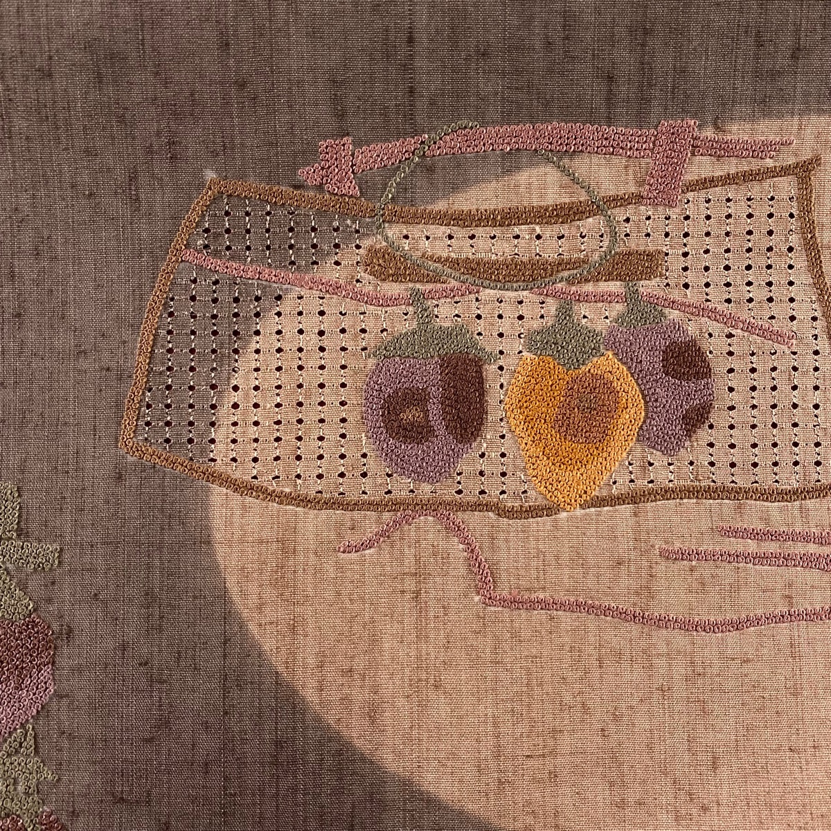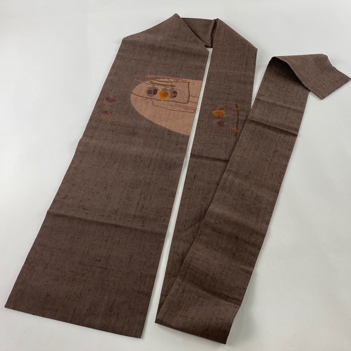 | 名古屋帯 美品 秀品 紬地 干し柿 籠 相良刺繍 汕頭刺繍 焦茶色 正絹 【中古】 |
