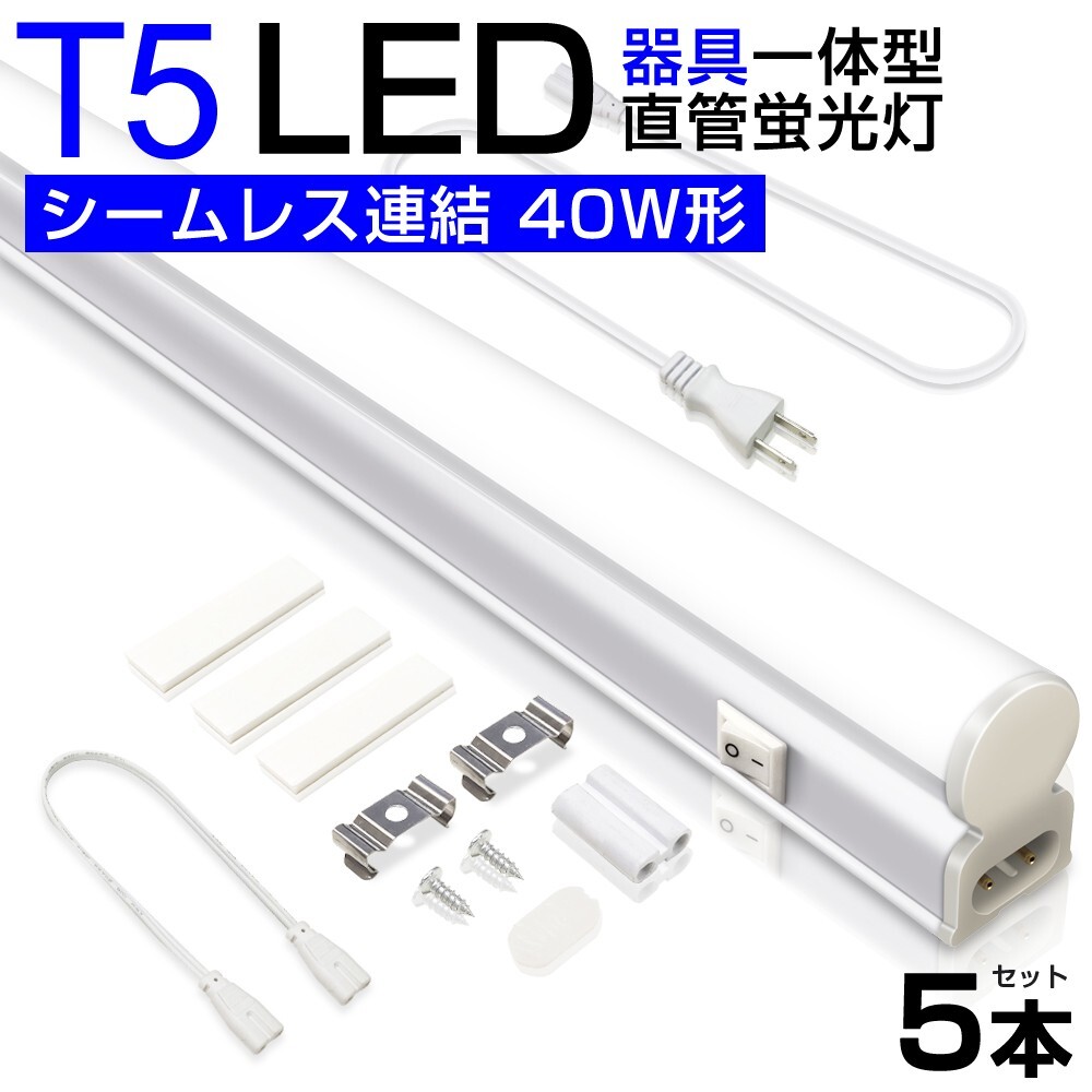 5本 T5 led蛍光灯 直管 器具一体型 40W形 昼光色6000K シームレス連結 スイッチ付 120cm 2500LM 消費電力20W 3Mコード AC85-265V D27
