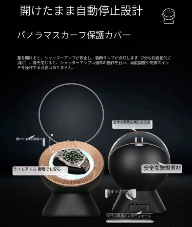 ウォッチワインダーは、開けると自動的に停止する設計で、LEDライト効果付きで時計の取り外しや収納が便利です。