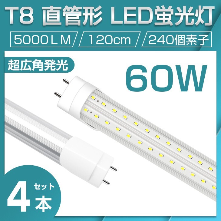 即納 業界最高 送料無料 4本セット 直管LED蛍光灯 60W形 昼光色6500K 5000lm 1200mm T8 240個素子 G13 照射角270° AC85-265V 1年保証D22