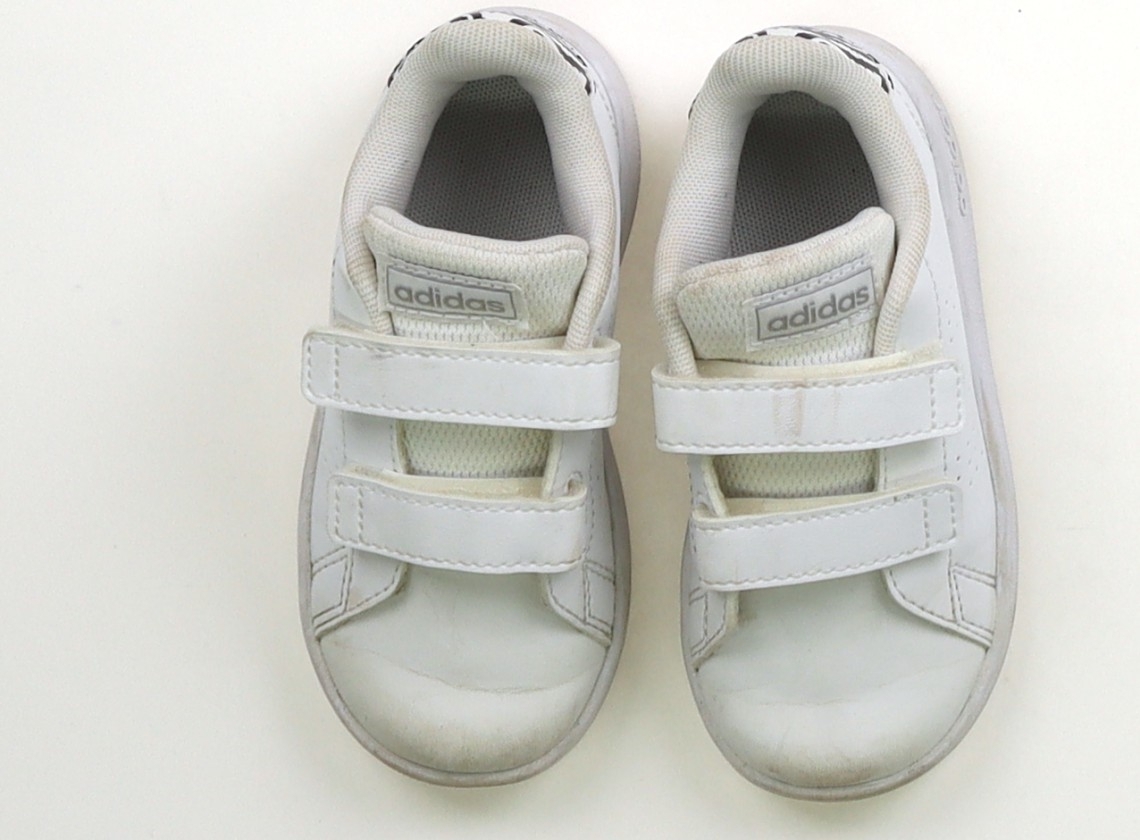 実際のサイズ表記は14cm。マジックテープ着脱。全体的に汚れていますが、まだお使いいただけそうです。つま先部分にシワあり。