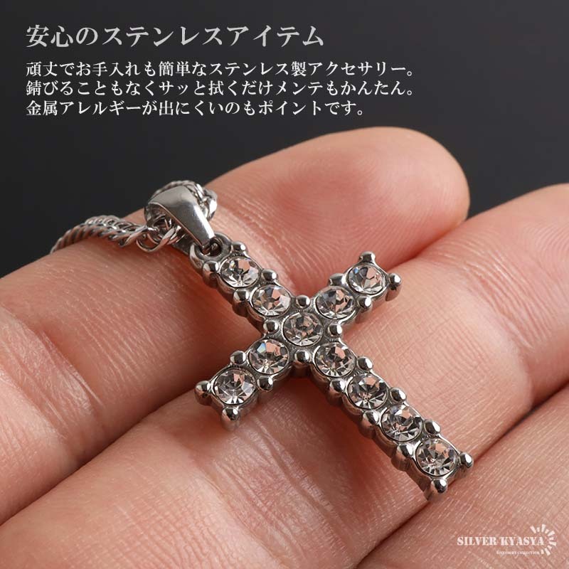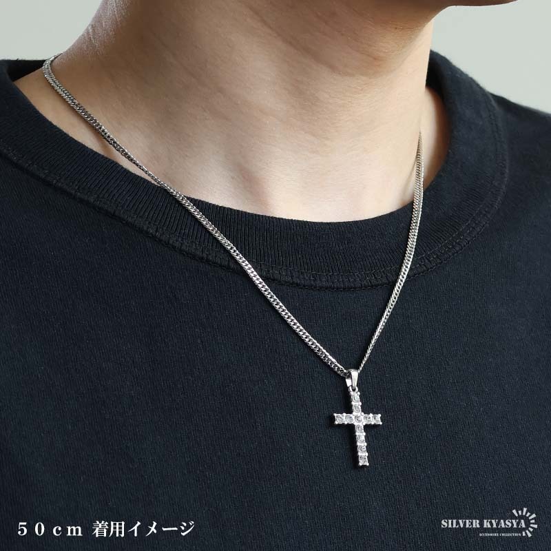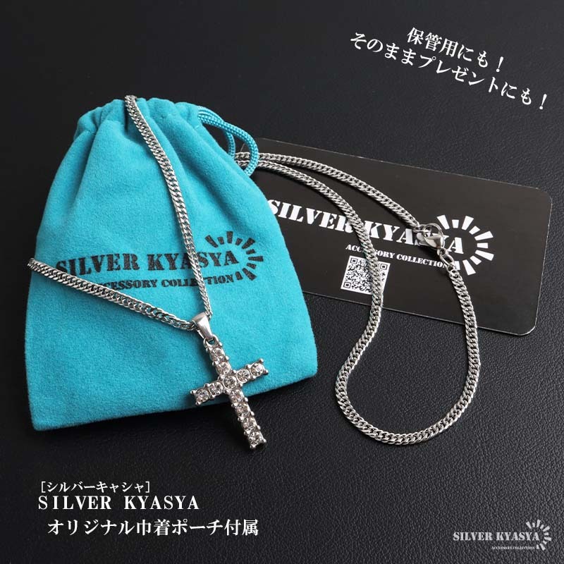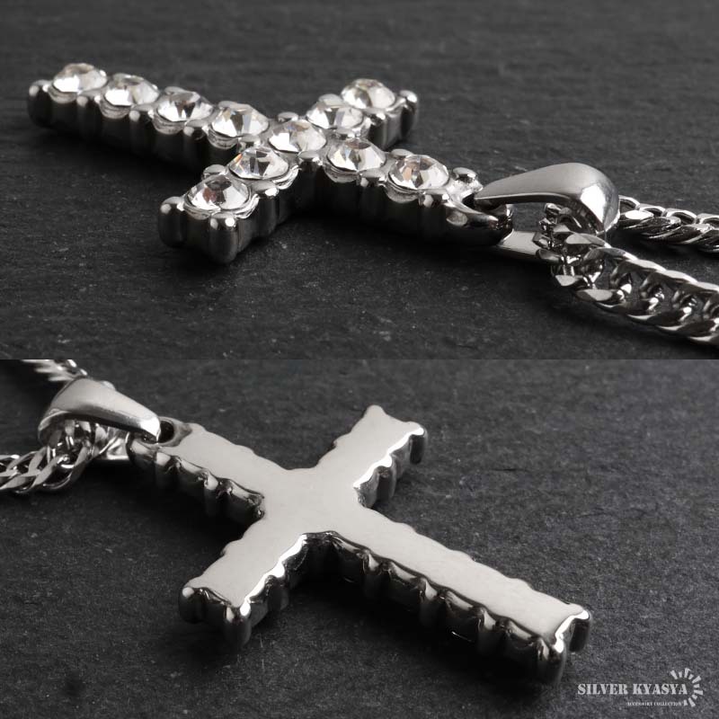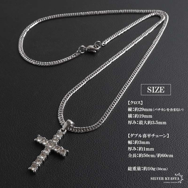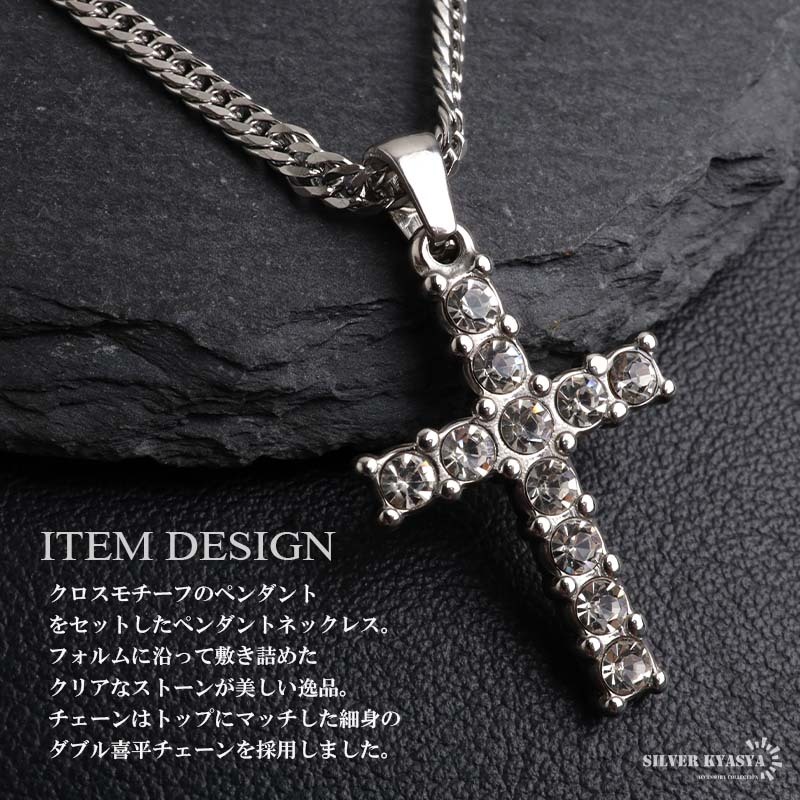 クロスモチーフのペンダントをセットしたペンダントネックレス。フォルムに沿って敷き詰めたクリアなストーンが美しい逸品。チェーンはトップにマッチした細身のダブル喜平チェーンを採用しました。