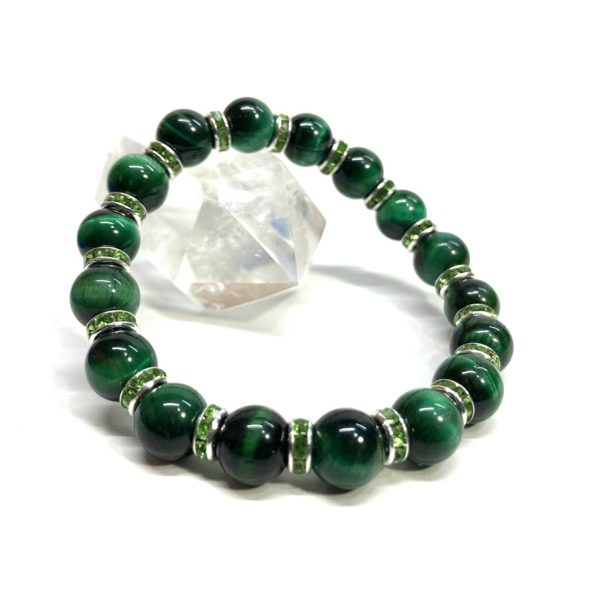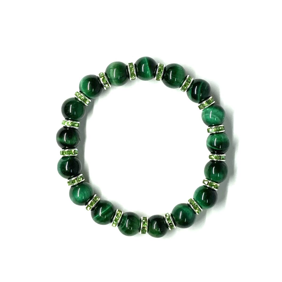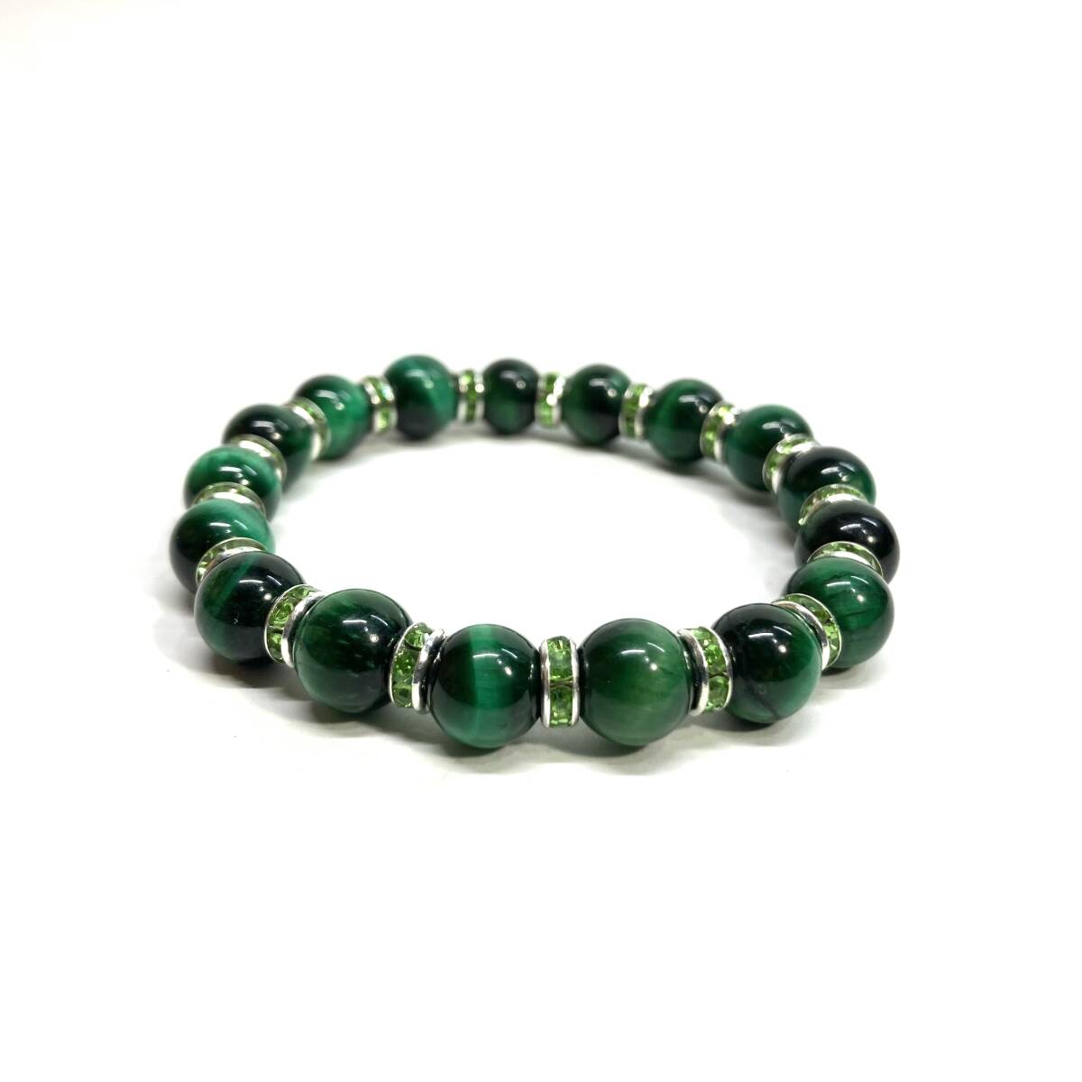 こちらは、グリーンタイガーアイの8mm玉を使用したパワーストーンブレスレットです。石との間にはロンデルを挟み高級感を演出しております。シンプルなデザインは、シーン問わずどんなコーディネートとも合わせ易いブレスレットです。サイズは内径約15cmです。当社の中でも一番人気の実績があるデザインとなっております。気になる方はお早めにどうぞ。