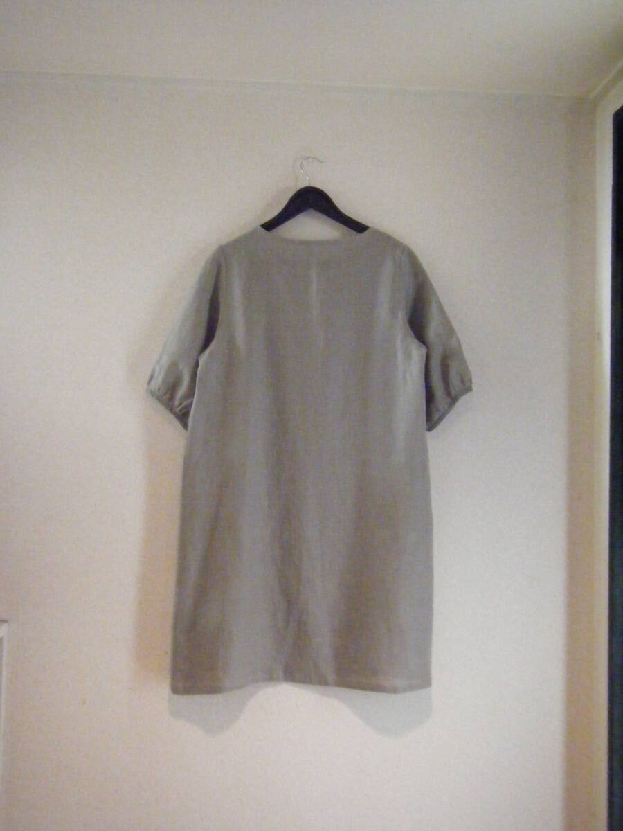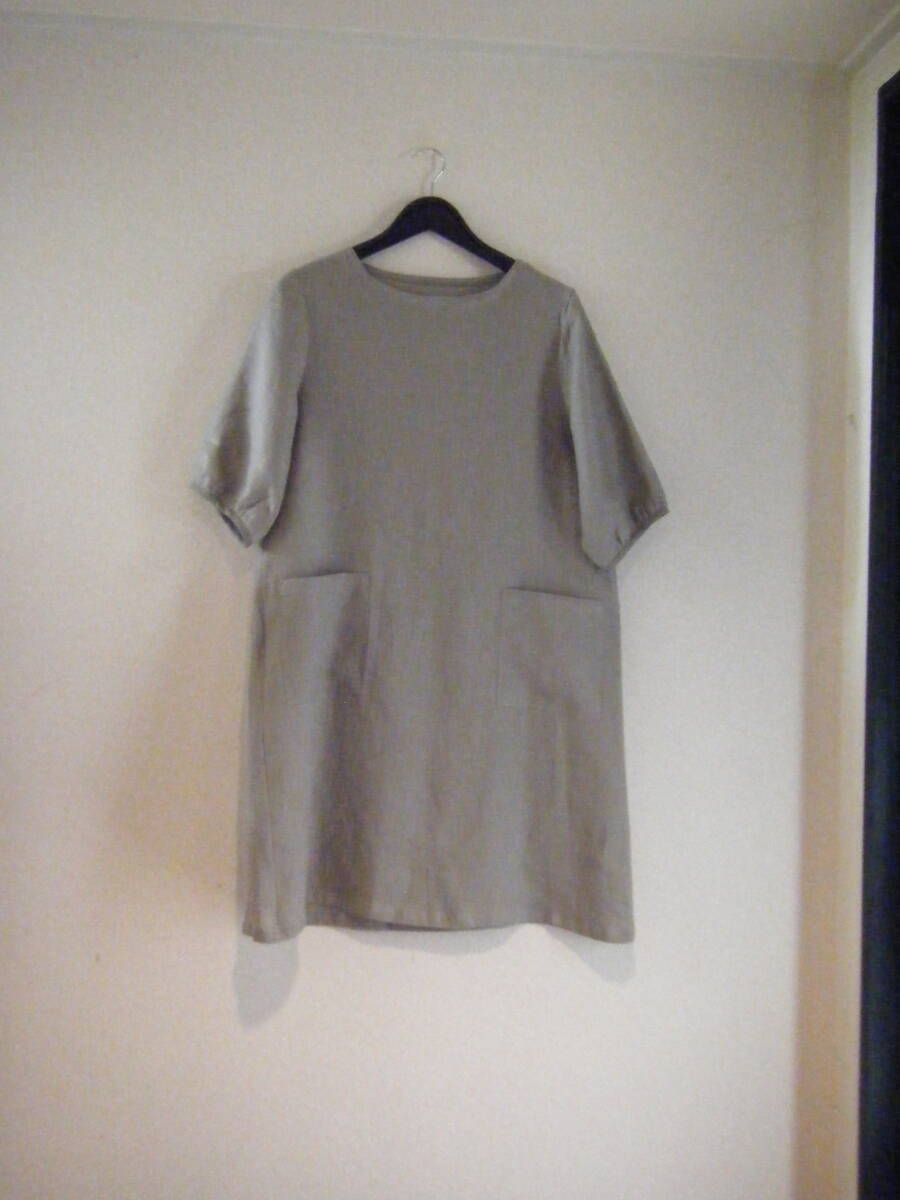 ☆ハンドメイド☆ リネン100ラウンドネックワンピース 5分袖ギャザー 胡桃染