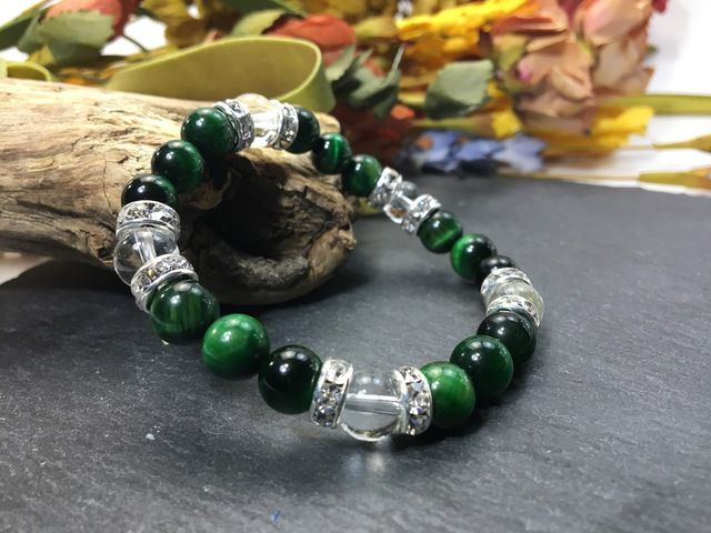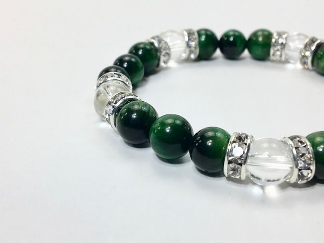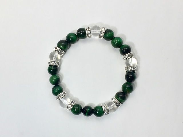 こちらは、8mm玉のグリーンタイガーアイと水晶を使ったパワーストーンブレスレットです。シンプルなデザインでどんなコーディネートにも合わせやすいデザインに仕上げています。サイズは内周約15cmです。気になる方は是非この機会にどうぞ。