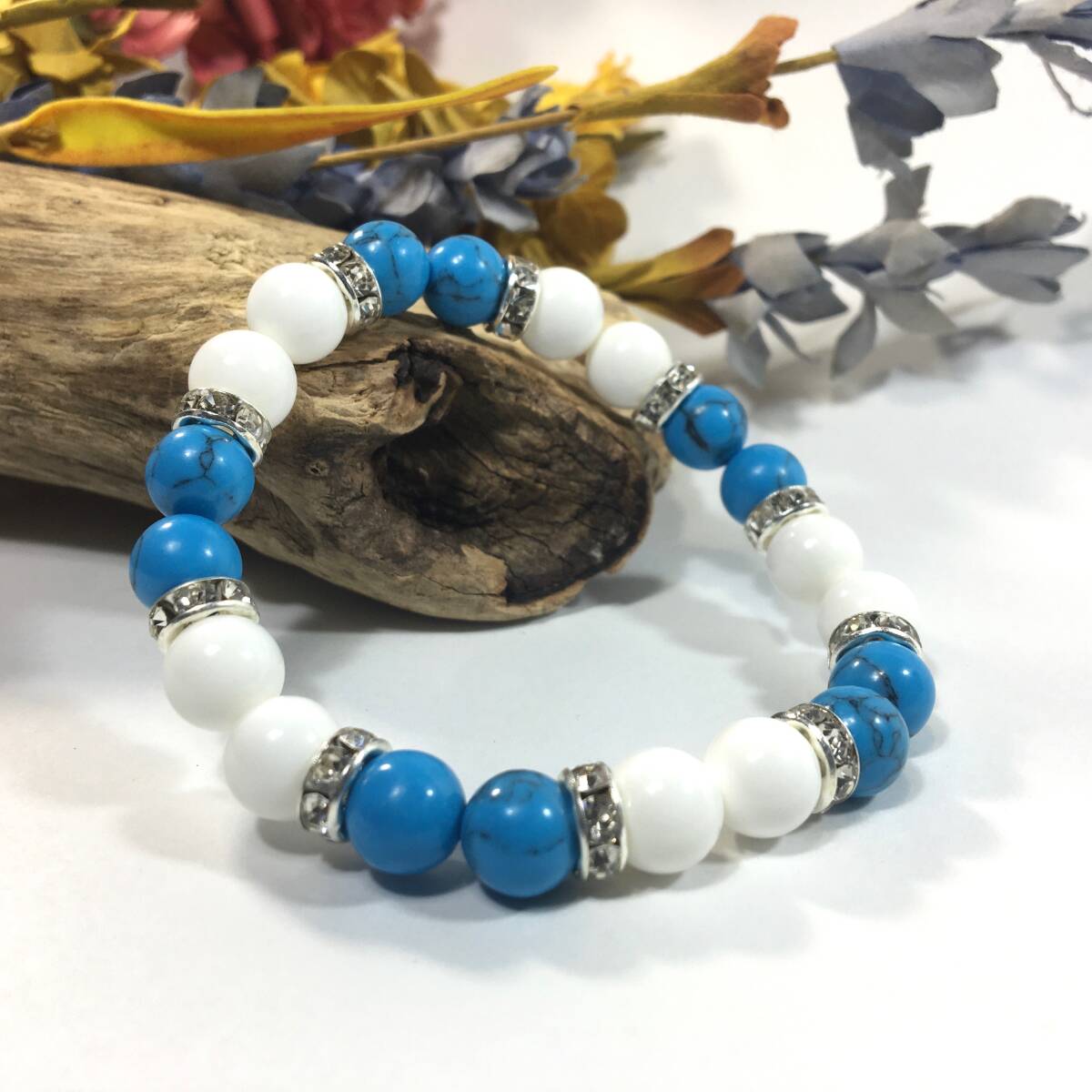 こちらは、8mm玉のターコイズとホワイトオニキスを使ったパワーストーンブレスレットです。シンプルなデザインでどんなコーディネートにも合わせやすいデザインに仕上げています。サイズは内周約15cmです。気になる方は是非この機会にどうぞ。