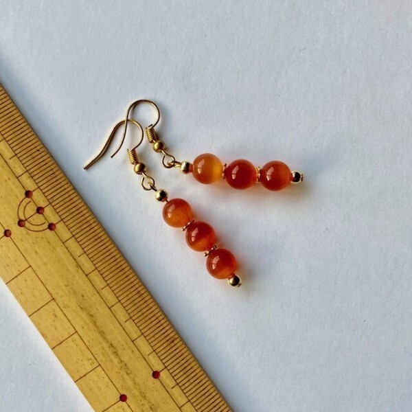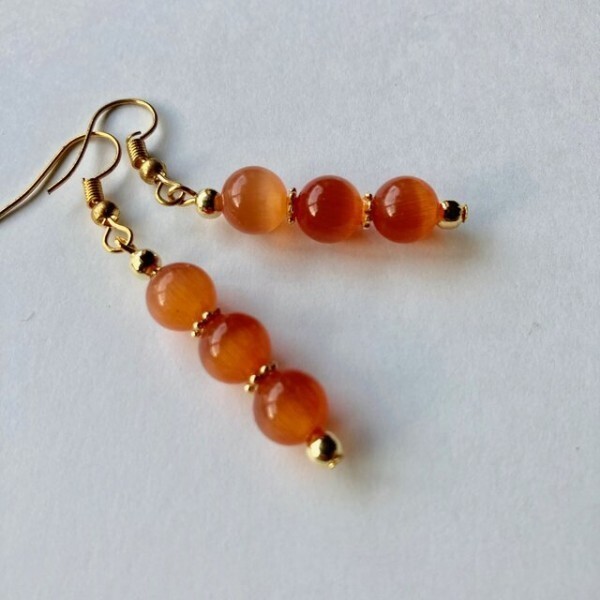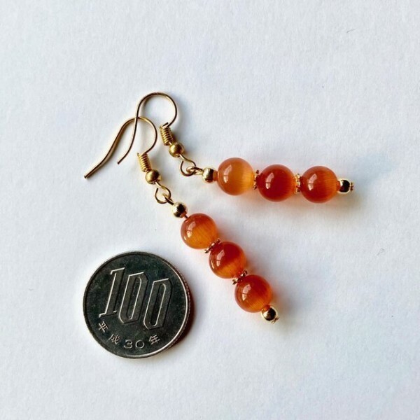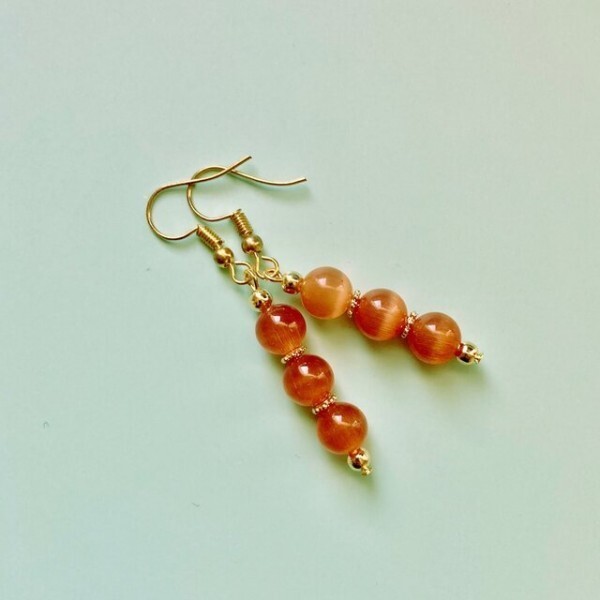 こちらは、8mm玉のキャッツアイを3個並べたフックピアスです。女性の可愛らしさを引き立ててくれるピアスになっております。シンプルなデザインですのでコーディネートにも合わせやすいデザインで、使い勝手がいいアイテムとなっております。
