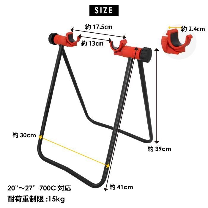 | ロードバイクやマウンテンバイク、クロスバイクなどに最適な自転車1台用スタンド。 スタンドを開いた状態で、上から車体を乗せるだけで取り付けできるチェーンステーで支えるタイプのメンテナンススタンドです。 メンテナンスだけでなく室内展示、室内保管用にご使用頂けます。 メンテナンスの邪魔にならず後輪を浮かせて安定して支えてくれますので 従来のクイックで支えるものより、装着が楽になるスタンドです。 ・ゴムバンドで車体をとめれるのでとても安定します。 ・クイックに挟むスタンドが苦手な方におすすめ。 ・組立も簡単で、使わないときは折りたたむ事可能です。 本体サイズ 材質:アルミ合金 対応:20インチから700Cまで カラー:ブラック、オレンジフック 付属品:フックx2、取付ネジ キズ、汚れがある場合がございます。正常に動作しない場合がございます。ジャンク扱いでお願いします。ノークレーム、ノーリターン | |