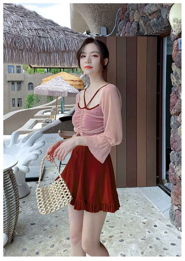 シアースリーブ ビキニ 体型カバー ワンピ 水着 パッド付き ノンワイヤー 3サイズ 2点セット L ワインレッド