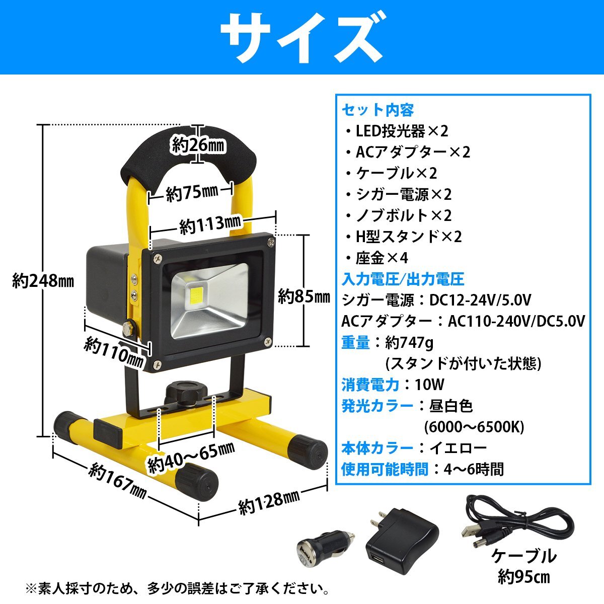持ち運びに最適! 充電式 ポータブル LED投光器 10W 6500k ホワイト AC100V/12V/24V 兼用 アウトドア/レジャー/作業灯/簡易照明 2個セット