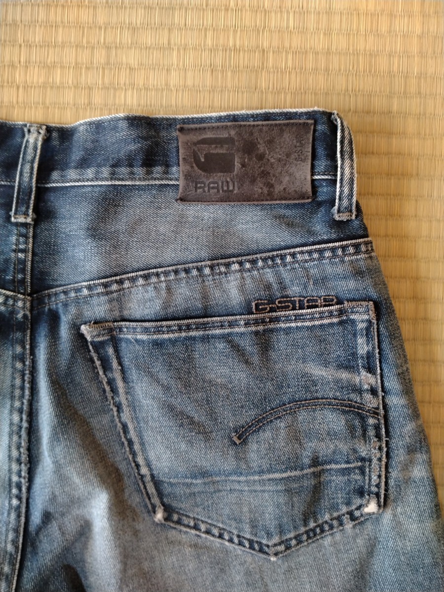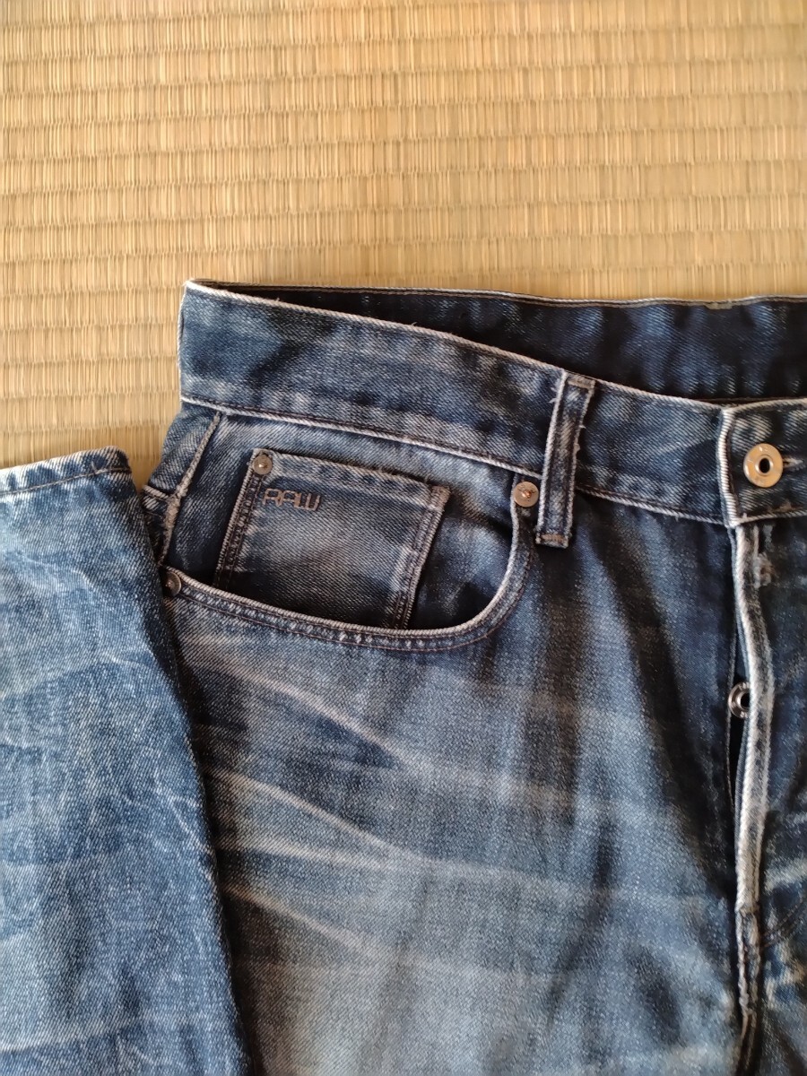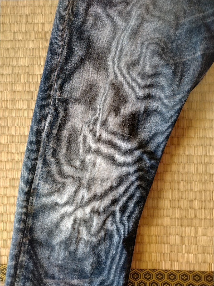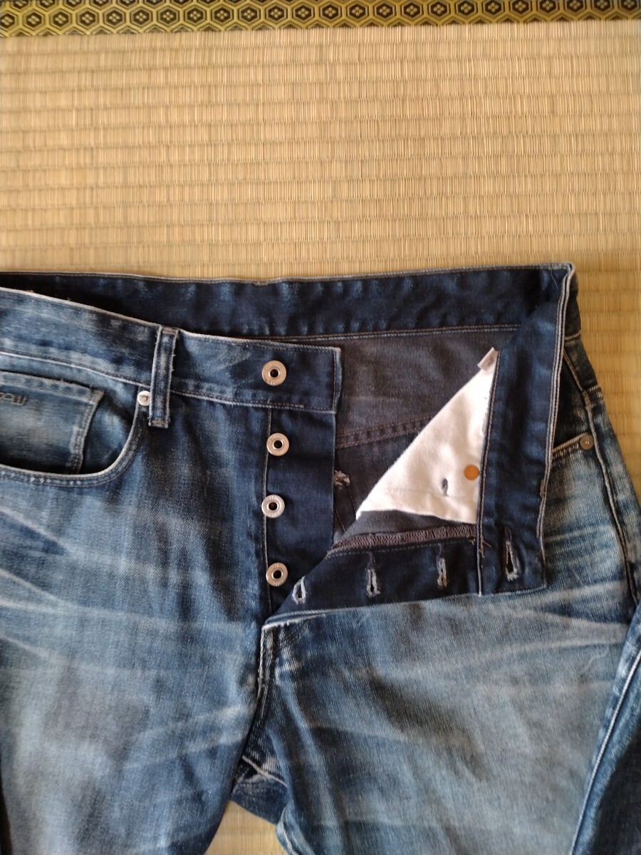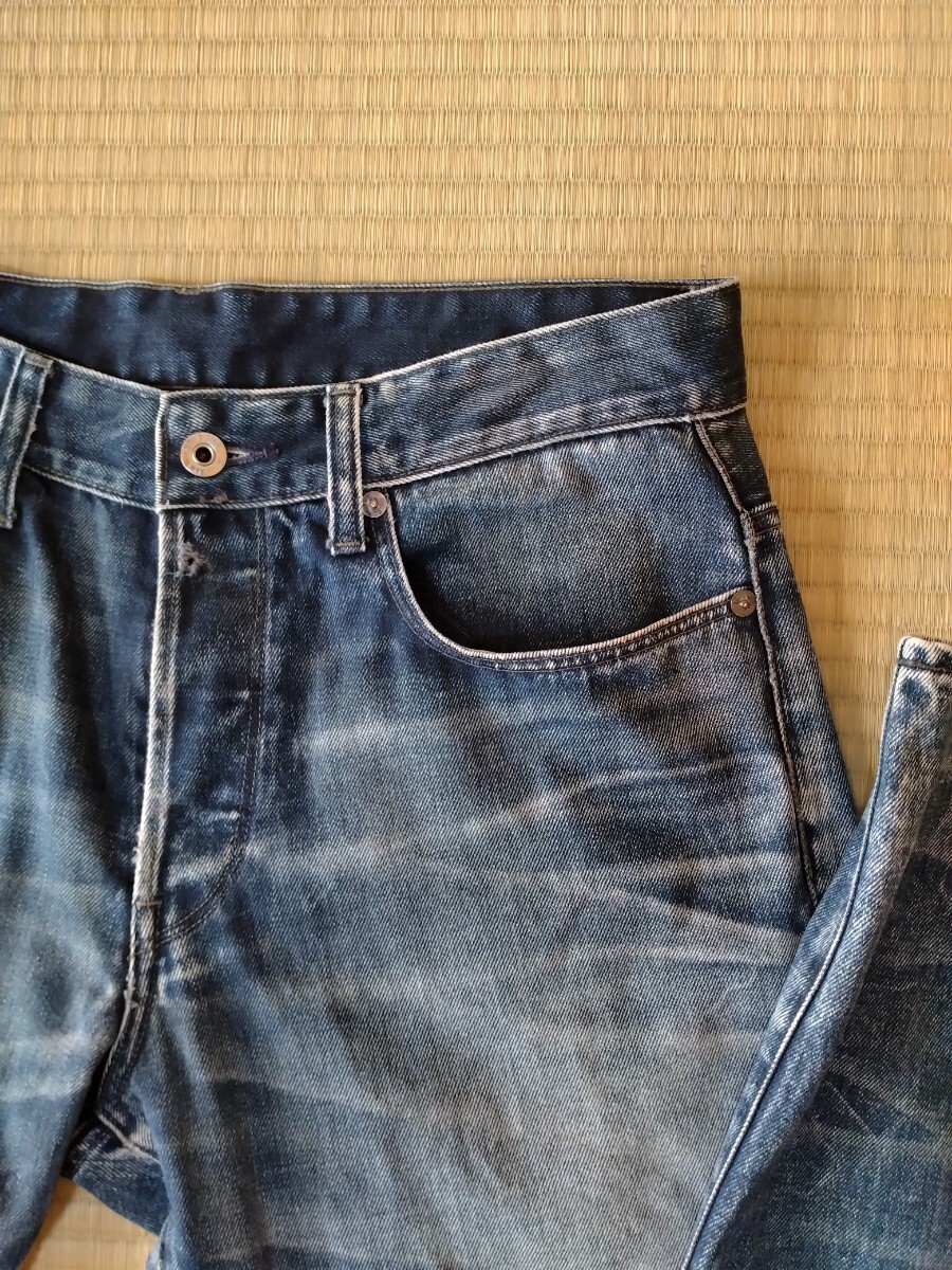 実寸サイズはウエスト44cm、股上28cm、股下79cm、渡り33cm、裾幅18cmです。