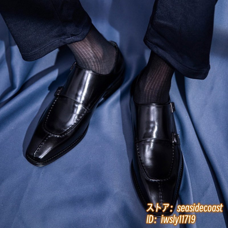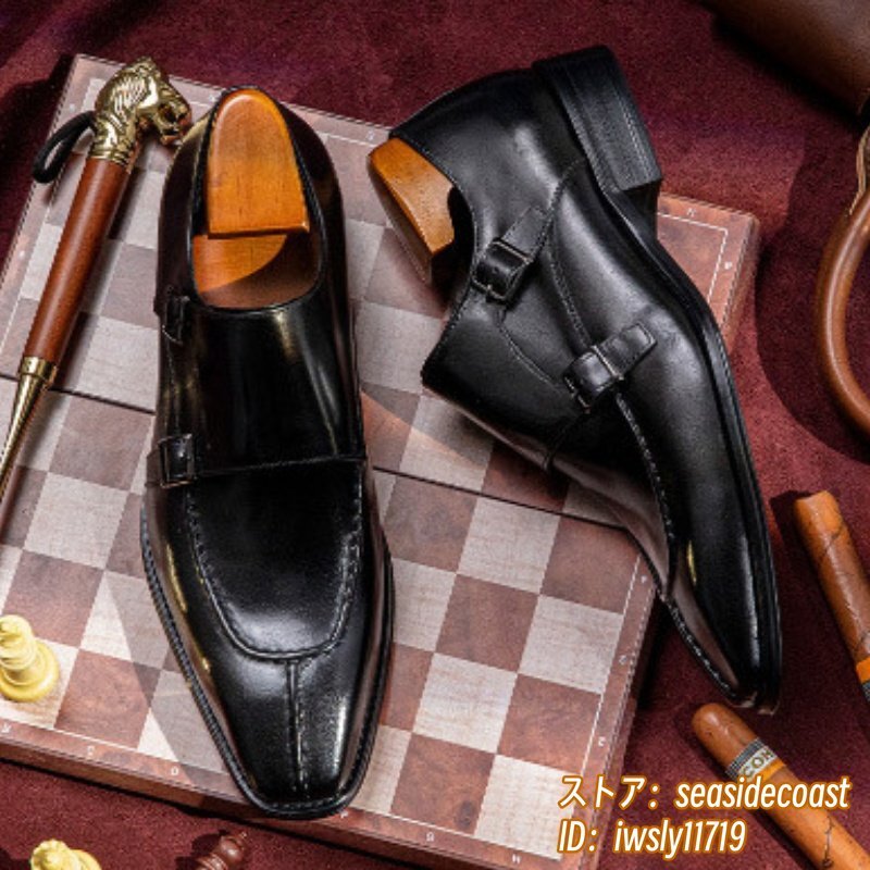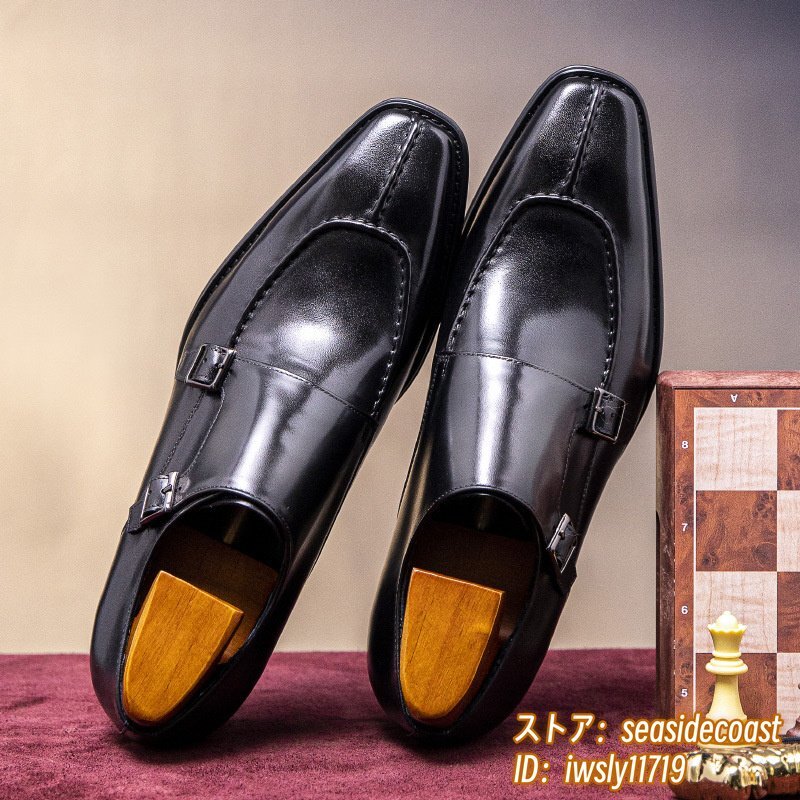 超希少◆ダブルモンクストラップ 本革 イギリス風 職人手作り ビジネスシューズ レザーシューズ 高級牛革 フォーマル 革靴 ブラック 25.5cm