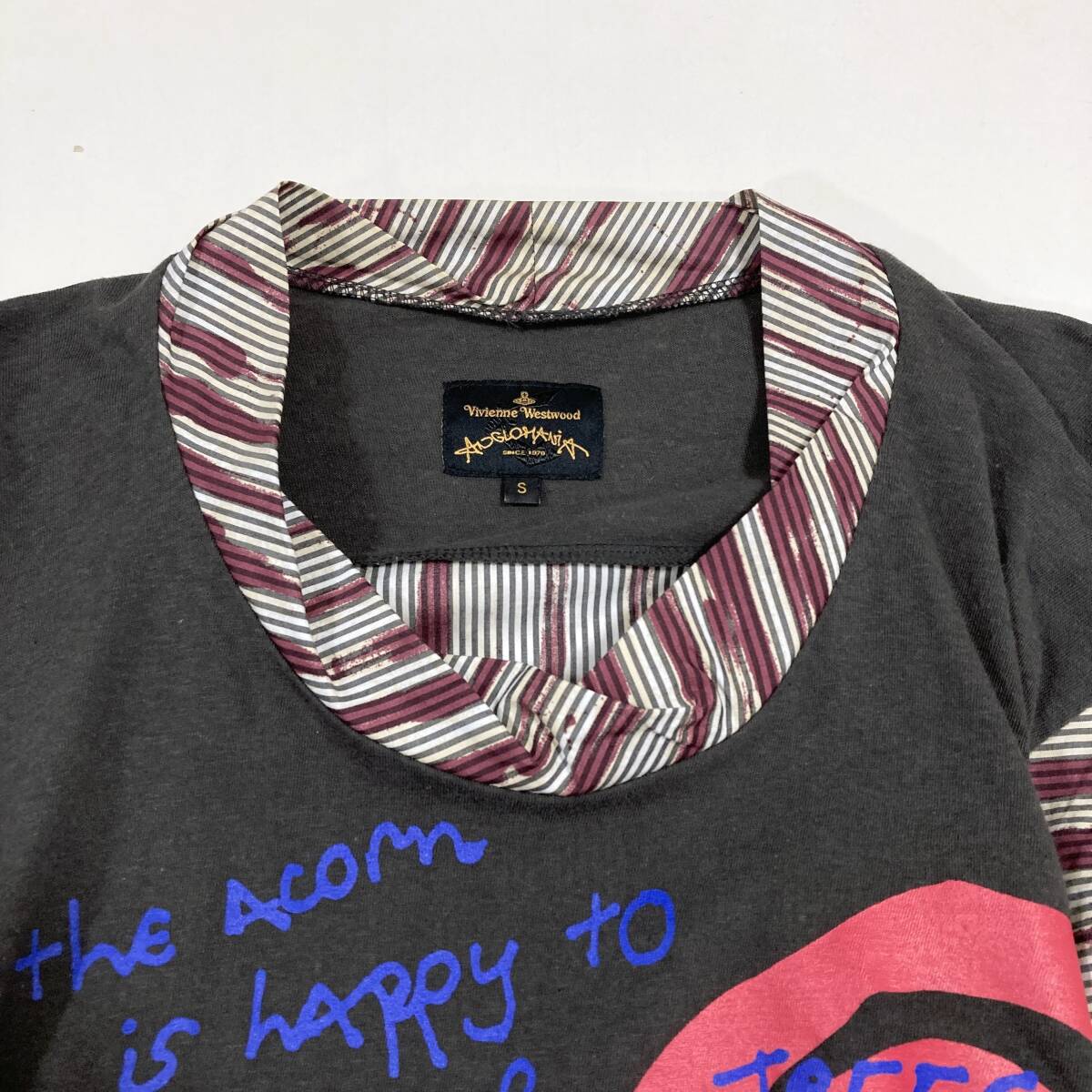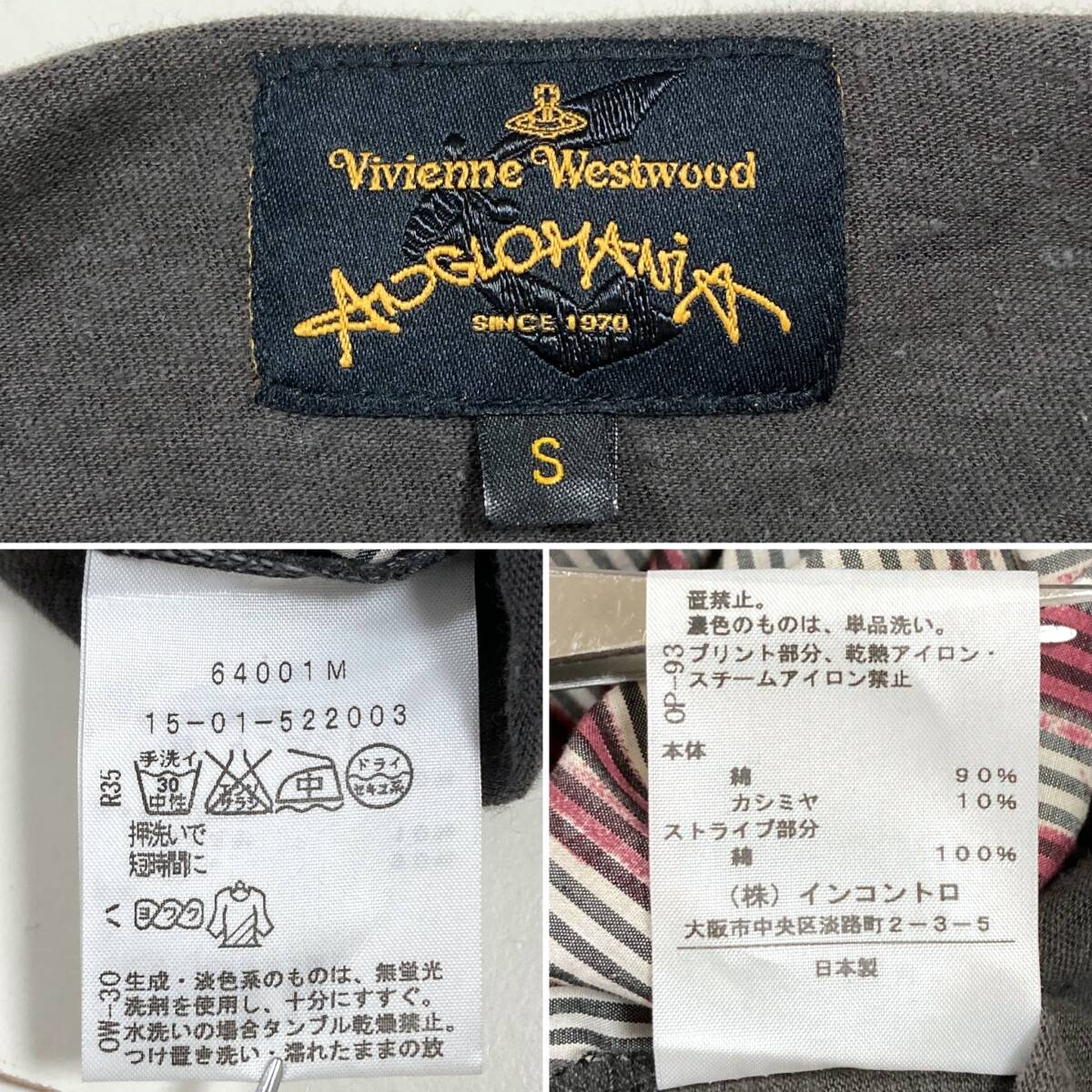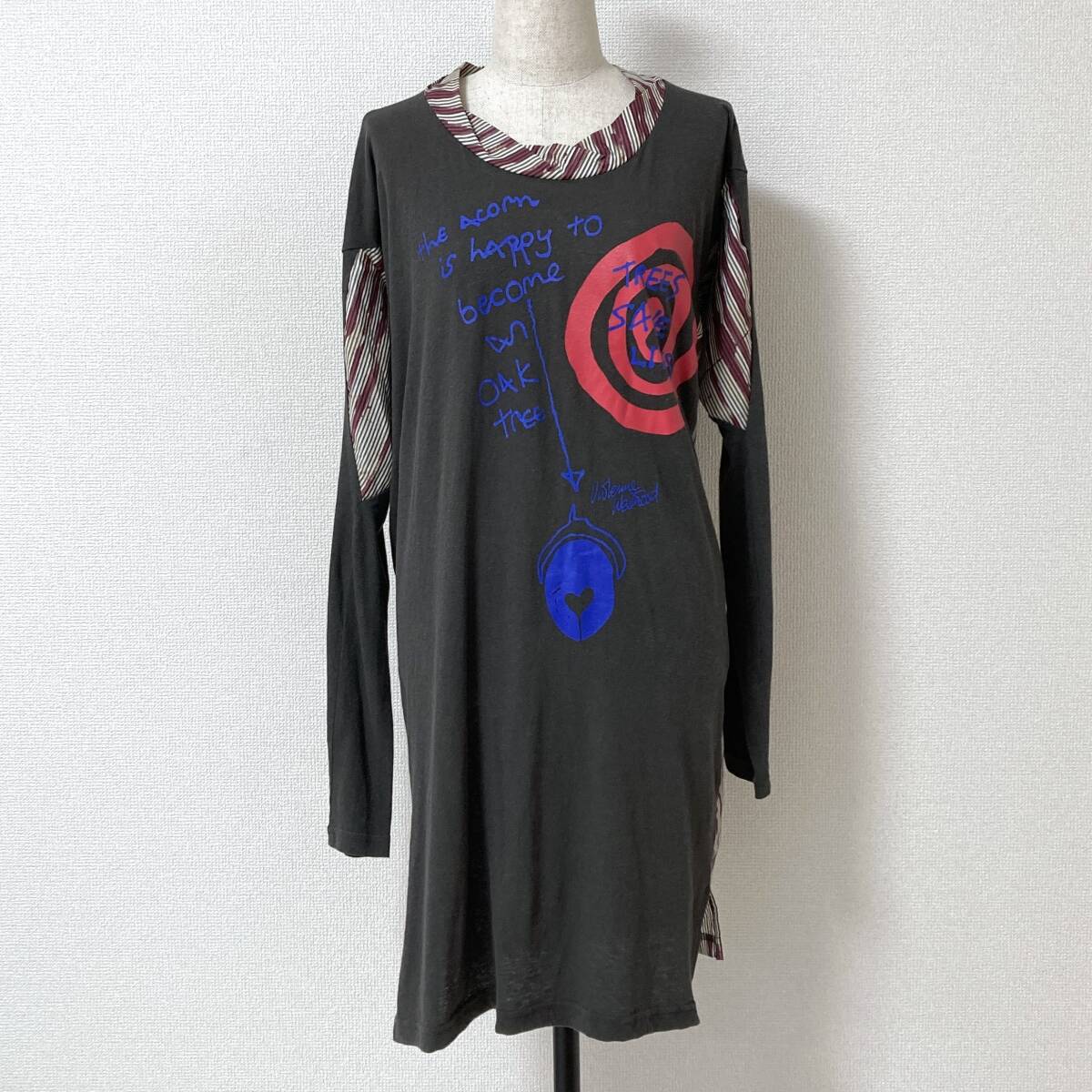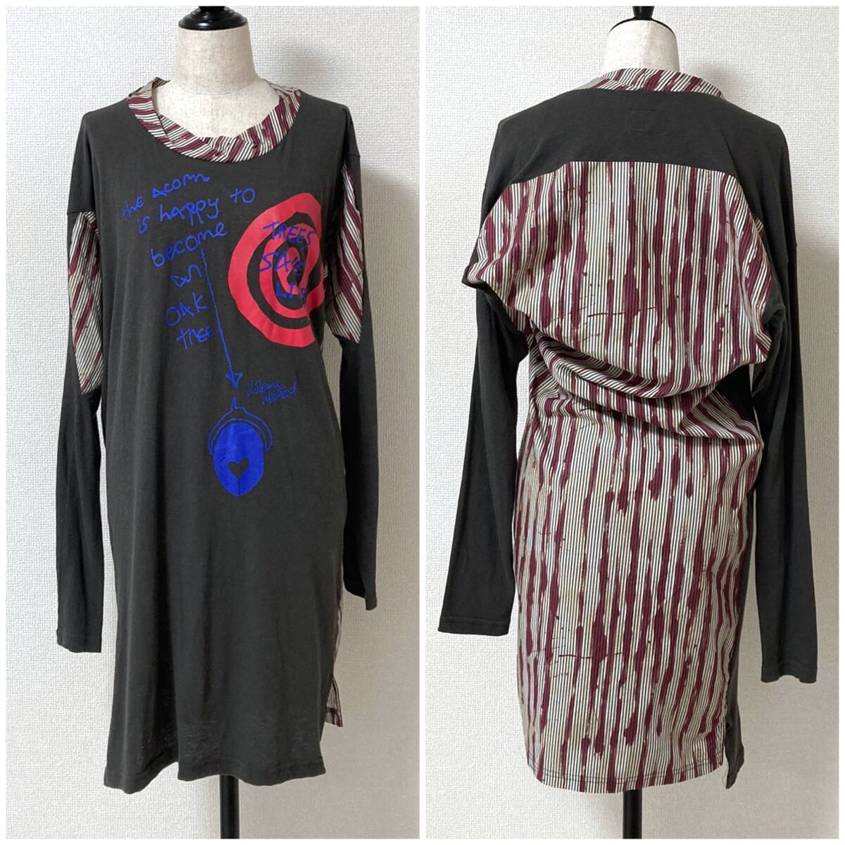 vivienne westwood ANGLOMANIA カシミヤ混 変形 切替 プリント ストライプ 長袖 カットソー ワンピース チャコールグレー系