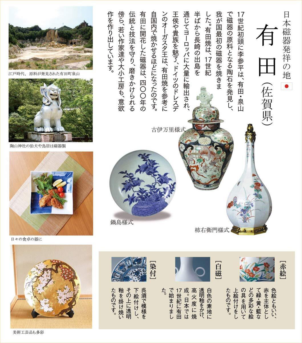 陶磁器の産地として400年の歴史を持つ有田焼。有田は佐賀県西部に位置し、日本で初めて磁器が生産されたことで有名。日本を代表する伝統工芸品です。