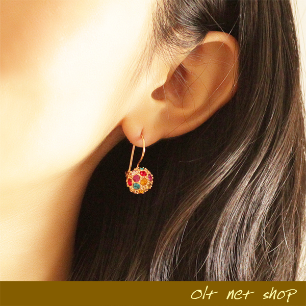 新品/ピアス/K18GP/ミラーボール/カラー/ダイヤ/フック/18金/ピンクゴールド/レディース/両耳/豪華/マルチカラー/CZ/上品/女性/PG