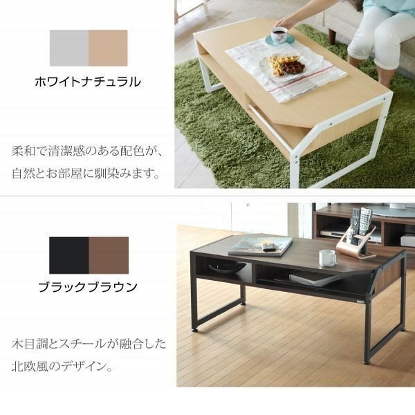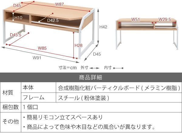 【カラー】 ブラック×ブラウン、ホワイト×ナチュラル 【サイズ】 <外寸> (約)幅91×奥行45×高さ42cm <内寸> 天板:(約)幅87×奥行45cm オープン部小:(約)幅29.5×奥行42.5×高さ10cm オープン部大:(約)幅51×奥行42.5×高さ10cm テーブル下:(約)幅85×奥行45.5×高さ28cm 【材質】 本体:合成樹脂化粧パーティクルボード(メラミン樹脂) フレーム:スチール(粉体塗装) 【耐荷重】 天板:(約)25kg以下 【生産国】 台湾 【梱包】 サイズ:(約)97.5×51×10cm、重量:(約)15kg 【その他】 ・簡易リモコン立てスペースあり 【組み立て品】 お客様による組み立てが必要です。 【ご注意】 商品によって色味や木目などの風合いが異なります |