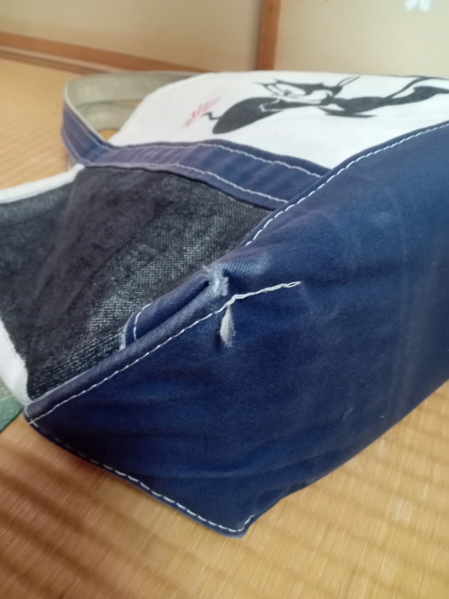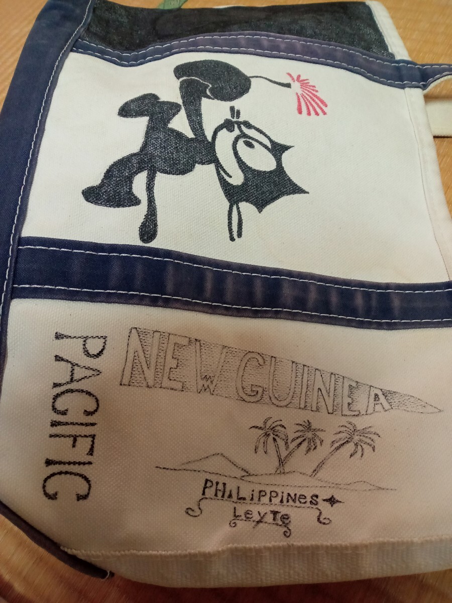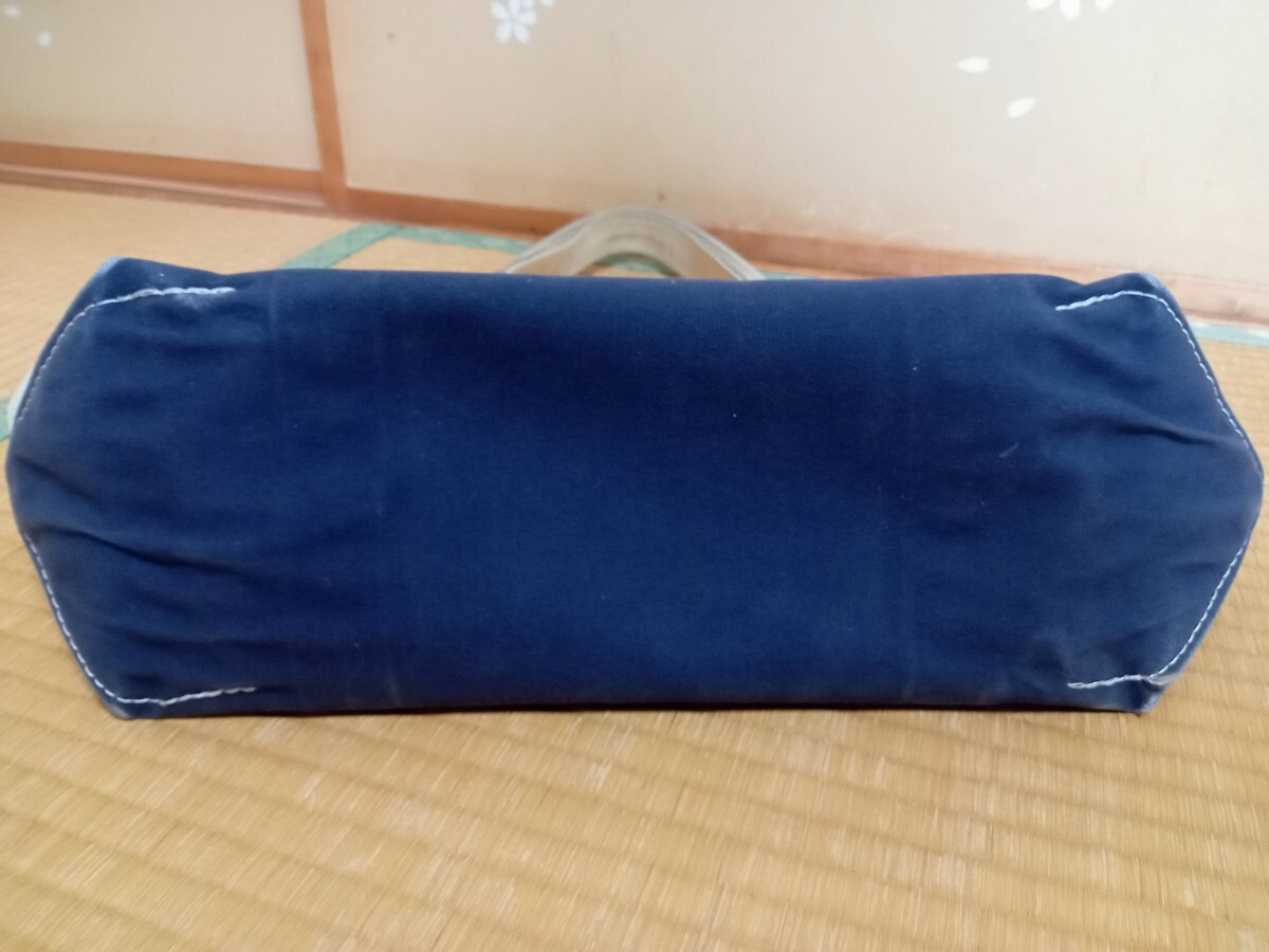 数年前に新品で購入したL.L.BeanのトートバッグMサイズ青になります。ある程度使った後、画像のようにマッキーでミリタリーの絵を参考に自身で描いてしまいました。向かって左側失敗して黒で塗りつぶしました。そのせいで使わなくなったので出品します。バッグ自体は頑丈なのでまだまだ問題なく使用できます。自立もします。画像では綺麗に見えますが全体的にかなり汚れ、擦れ、黄ばみ、焼けあります。