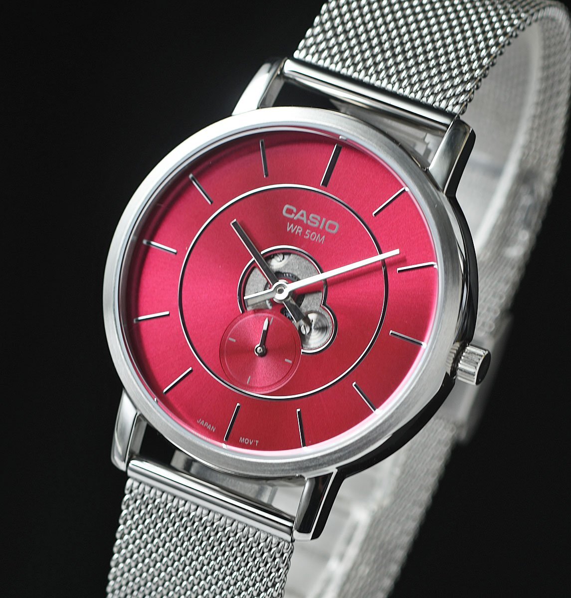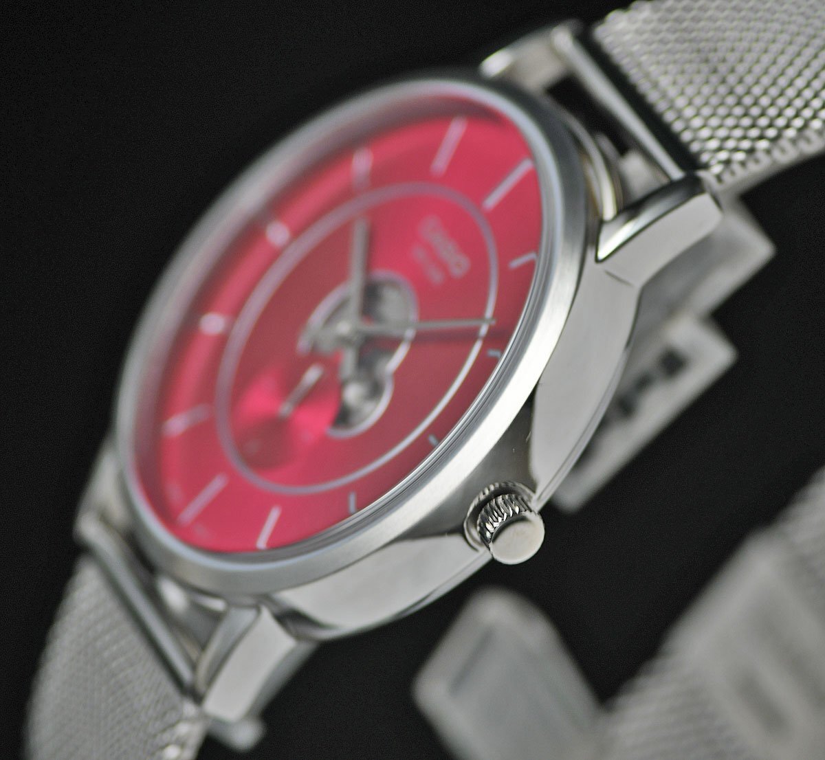 華やかなルビーレッドメタリックの文字盤はハーフスケルトンで機械の内部を垣間見る事が出来ます。