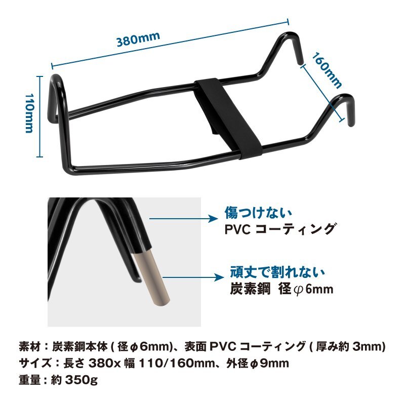 ハンドルと前輪タイヤのぐらつきを防止して真っ直ぐに固定できる便利なハンドルリテーナーです。 前輪がふらふらしないのでメンテナンスや洗車などの作業もストレスなくはかどります。 ハンドルを固定する事で作業性が向上。 後輪固定タイプの自転車スタンドで駐輪の場合にはハンドルが左右に振れてタイヤが壁にこつこつあたって壁を汚してしまう小さいストレスもハンドルを固定する事で解消します。 タイヤを真っ直ぐに出来るので綺麗に駐輪できるのもポイント。 グラつきによるストレスが減り快適に。またタイヤを外した自転車を固定するのに便利です。 装着もうすぐにできて様々なタイプの自転車に対応するので持っておいたら重宝します。 日々使うのも面倒にならない。 [傷つけない] 自転車と接する外側はPVCコーティングでハンドルやトップチューブを傷つけない。 また内側は炭素鋼素材なので強く頑丈で折れたり割れたりしない。 [ゴムバンドでロック] ゴムバンドで自転車とハンドルリテナーを固定します。 ゴムバンドは前後にスライド可能で自転車に合わせて調整できる。 [用途] メンテナンスや修理、整備や自転車保管、輸送時、自転車駐輪のサポートに。 ハンドルやフロント回りが動かない用に固定できる。 [適用自転車] ハンドル径最大径32mm、トップチューブ最大径50mmに対応。 だいたいの自転車にお使い頂けます。 商品内容ハンドルリテーナー サイズ長さ380x幅110/160mm、外径φ9mm 重量約350g 材質炭素鋼本体(径φ6mm)、表面PVCコーティング(厚み約3mm) 適用車種ハンドル径最大φ32mmやトップチューブ最大φ50mmにも対応し、ほとんどのロードバイクとMTBに使用可能です。 ・ディスプレイ環境により実物と色が異なる場合が有ります。 ・入荷時期により予告無く一部仕様変更する場合が有ります。 ・表記サイズは商品の伸びの無い寸法計測数値です。 |