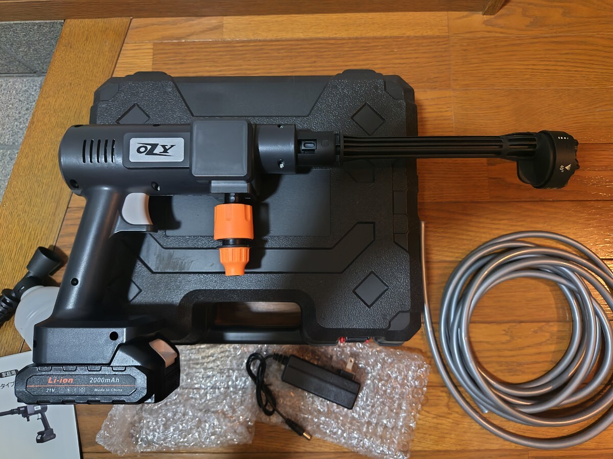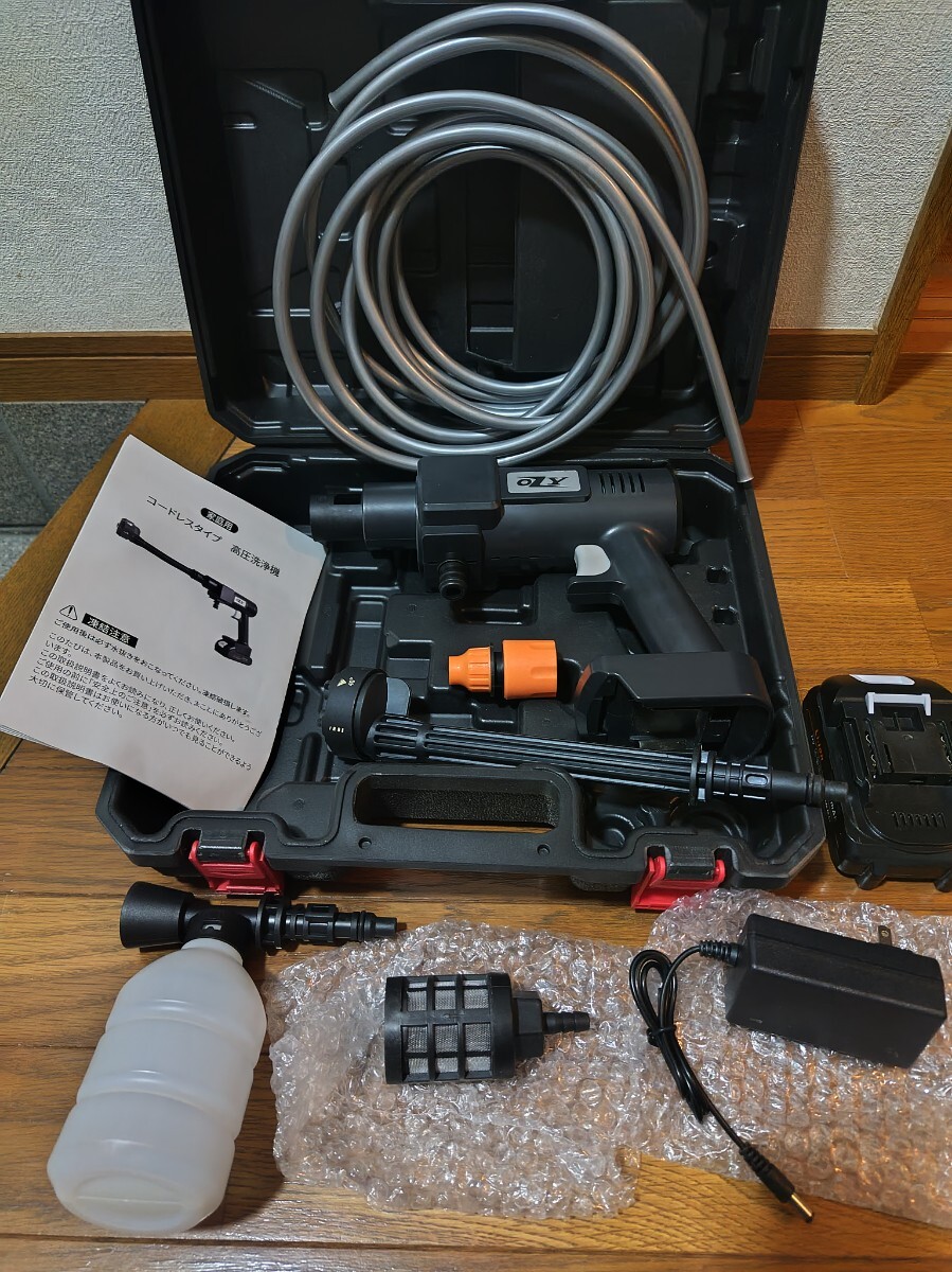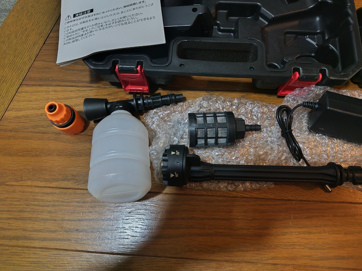 セット内容:本体、6in1ノズル、バッテリー、充電器、収納ケース、専用ホース、フィルター、説明書、洗剤ポット、洗剤ノズル。