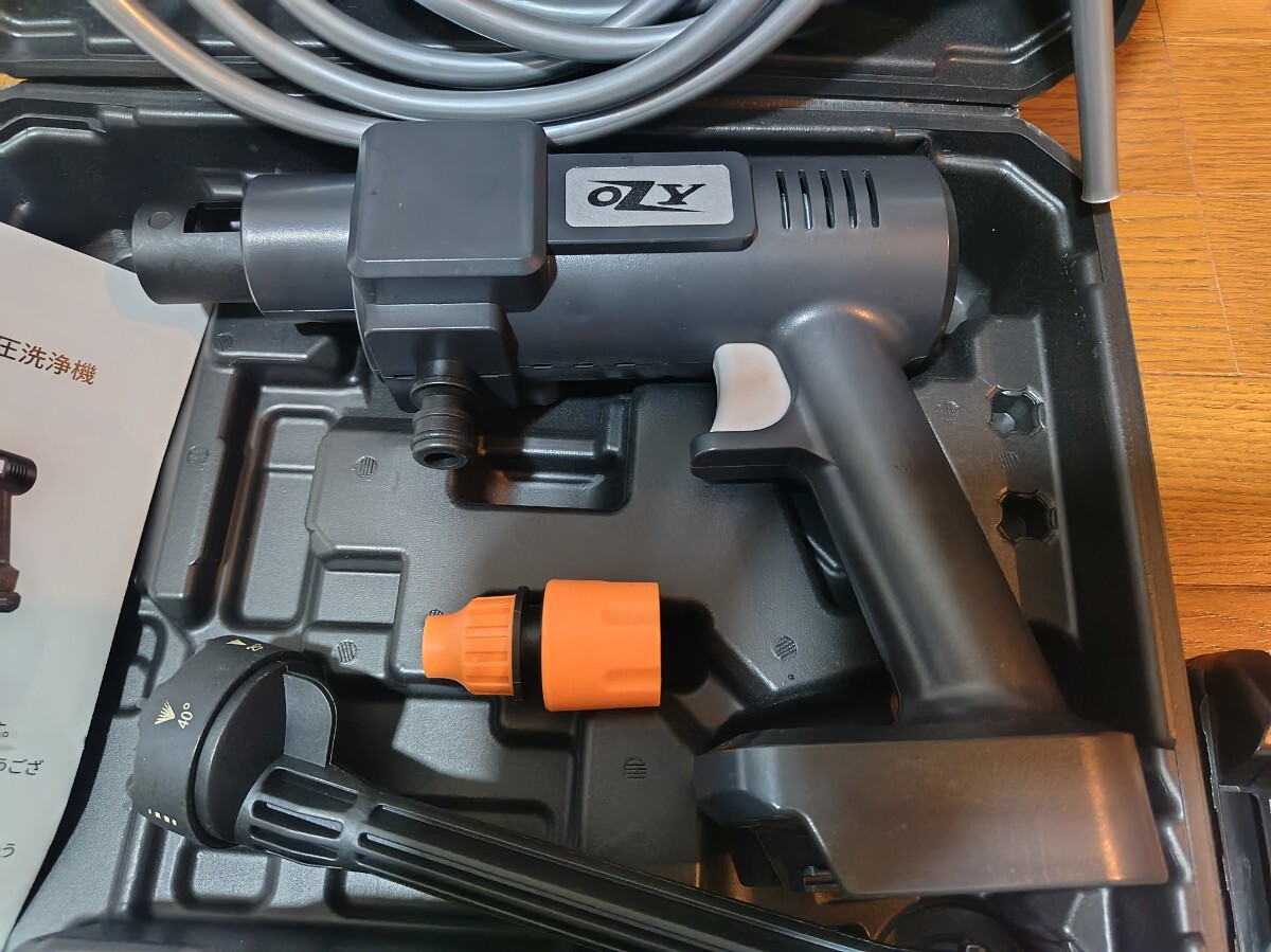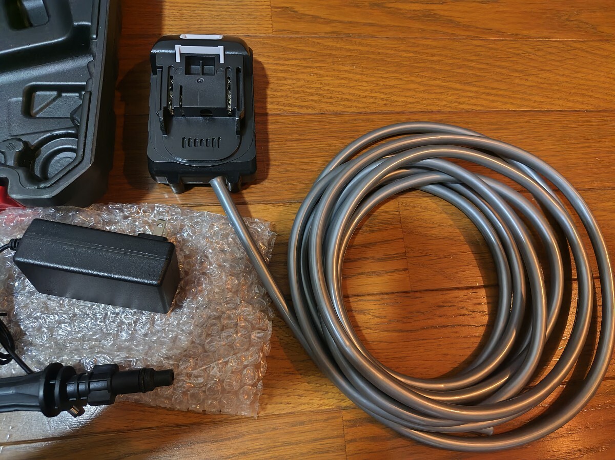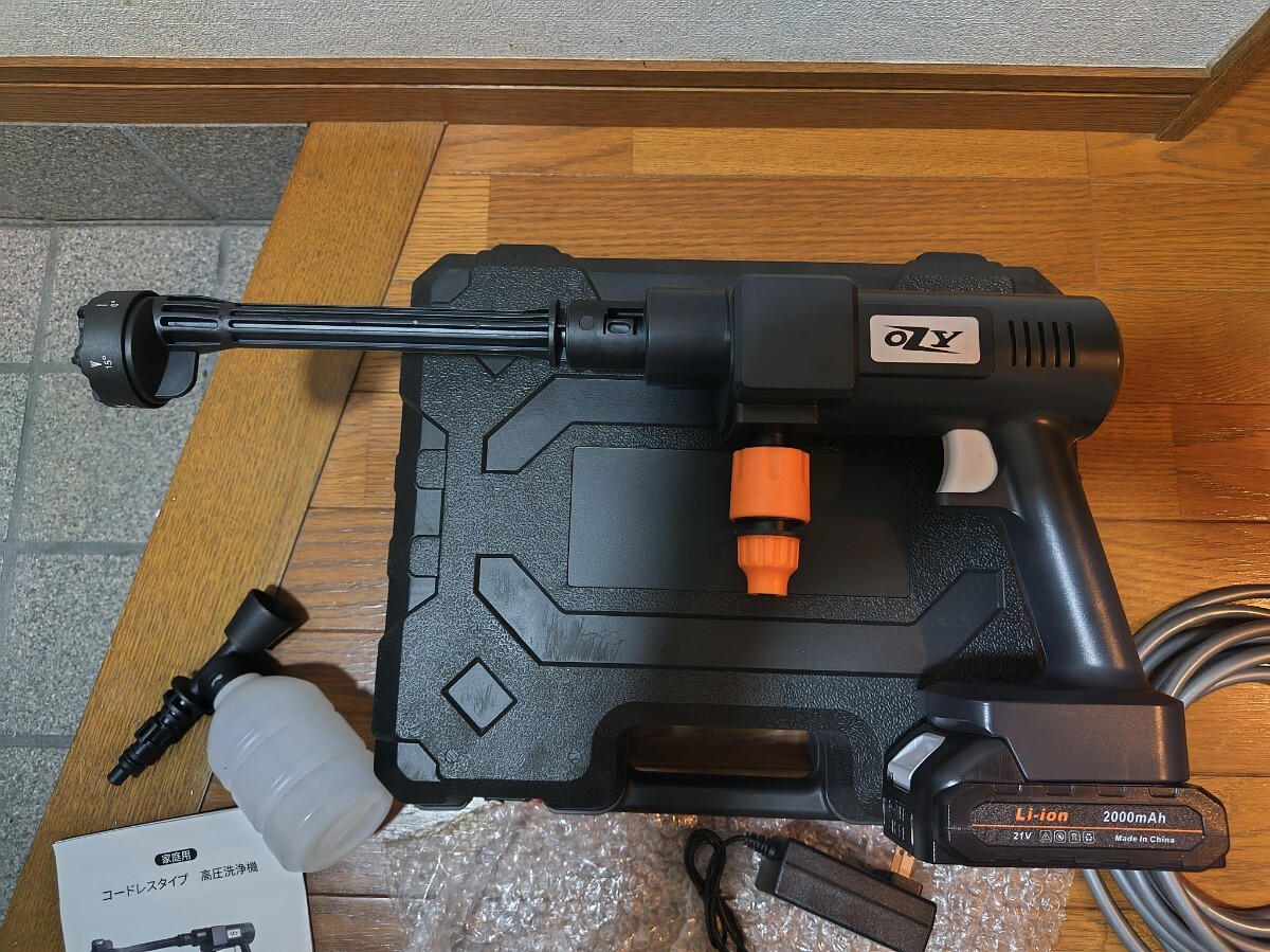 セット内容:本体、6in1ノズル、バッテリー、充電器、収納ケース、専用ホース、フィルター、説明書、洗剤ポット、洗剤ノズル。