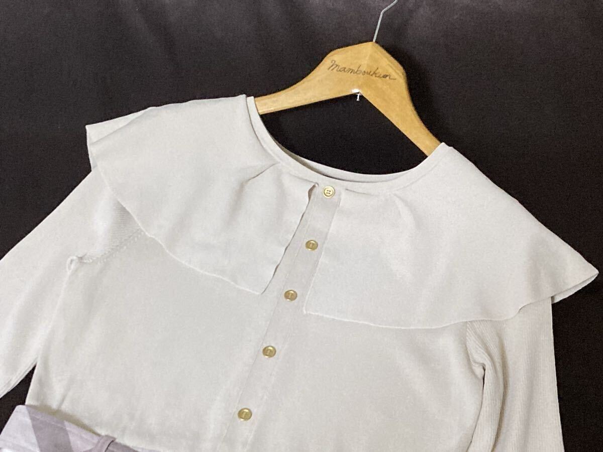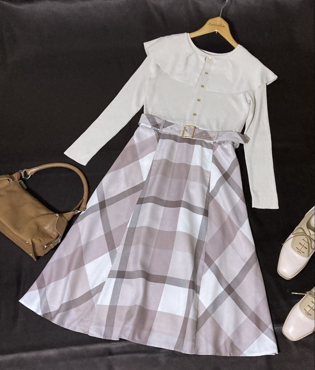 肩のフリルが可愛いニットにクレストブリッジらしいチェック柄スカートのドッキングワンピースです。上部ニットはお袖だけリブ編みになっています。左サイドにファスナーが付いています。ベルトのバックルにブランドロゴが刻印されています。