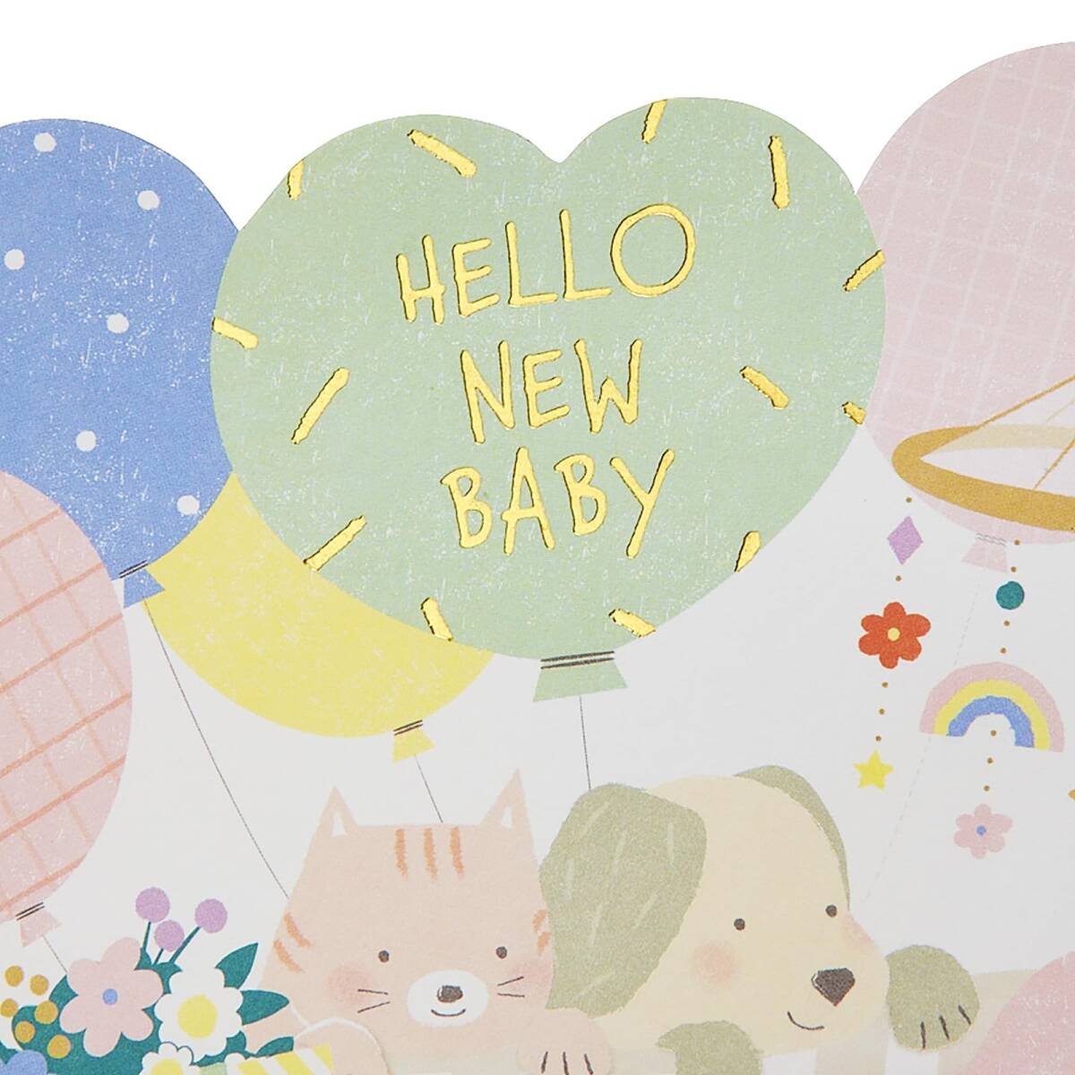 赤ちゃんの性別を問わず贈れる、淡い色合いでやさしく描かれたゆりかご形のカードです。