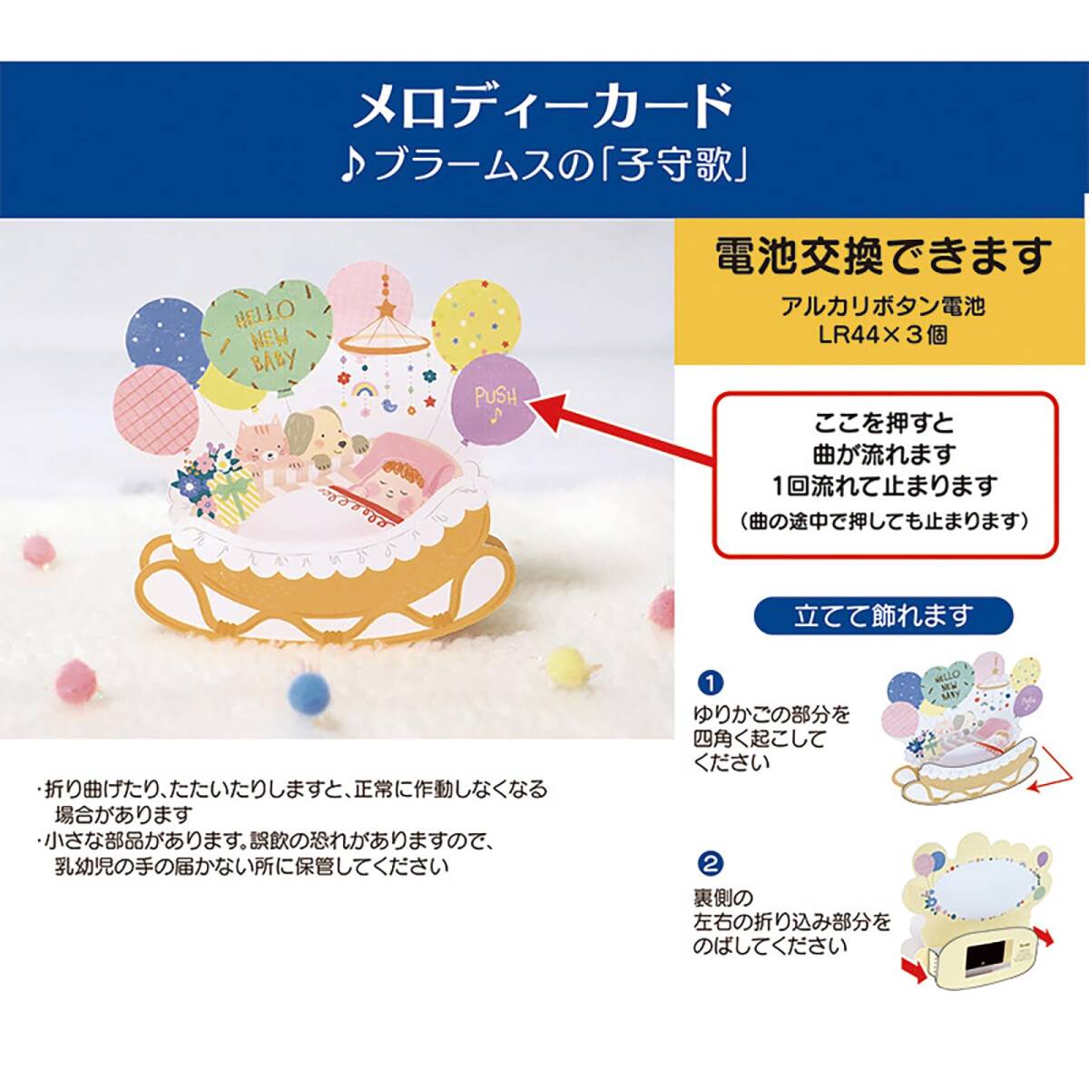 ・13x15.5x0.5cm ・立体メロディーカード ・赤ちゃんの性別を問わず贈れる、淡い色合いでやさしく描かれたゆりかご形のカードです。ボタンを押すと、オルゴール音でブラームスの「子守歌」が流れます。「赤ちゃんのご両親へ」だけでなく「ご両親から赤ちゃんへ」の初めてのお手紙ギフトとしてもおすすめです。立てて飾れます。カードの裏側にメッセージスペースがあります。電池交換できます。メロディーは動画でお聞きください(動画内のカードは試作サンプルのため、実際とは一部異なる場合があります。動画には撮影のための演出小物が含まれています。商品ではございませんので、あらかじめご了承ください)。 ・郵送の際は、郵便局で料金をお確かめください。 ・2023 SANRIO CO., LTD.