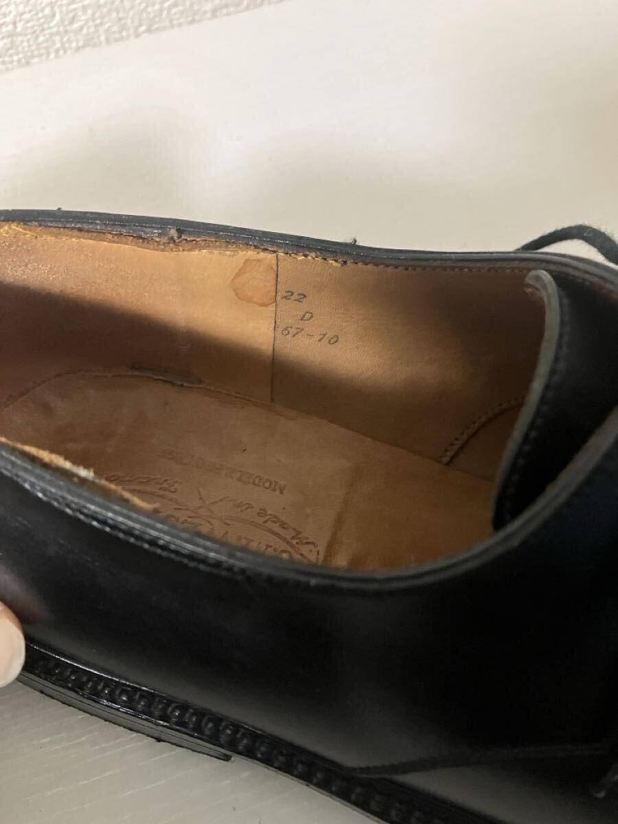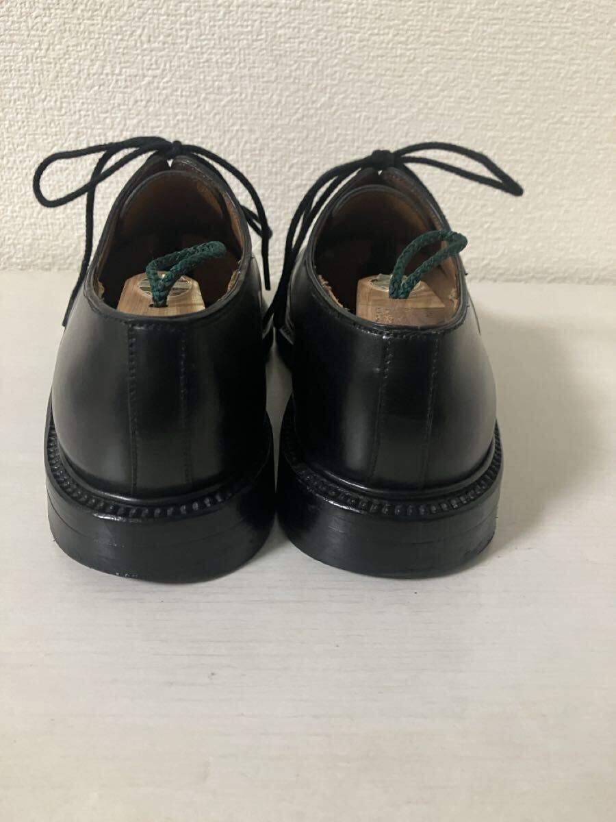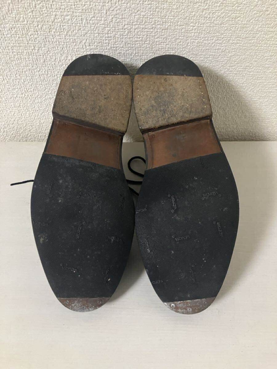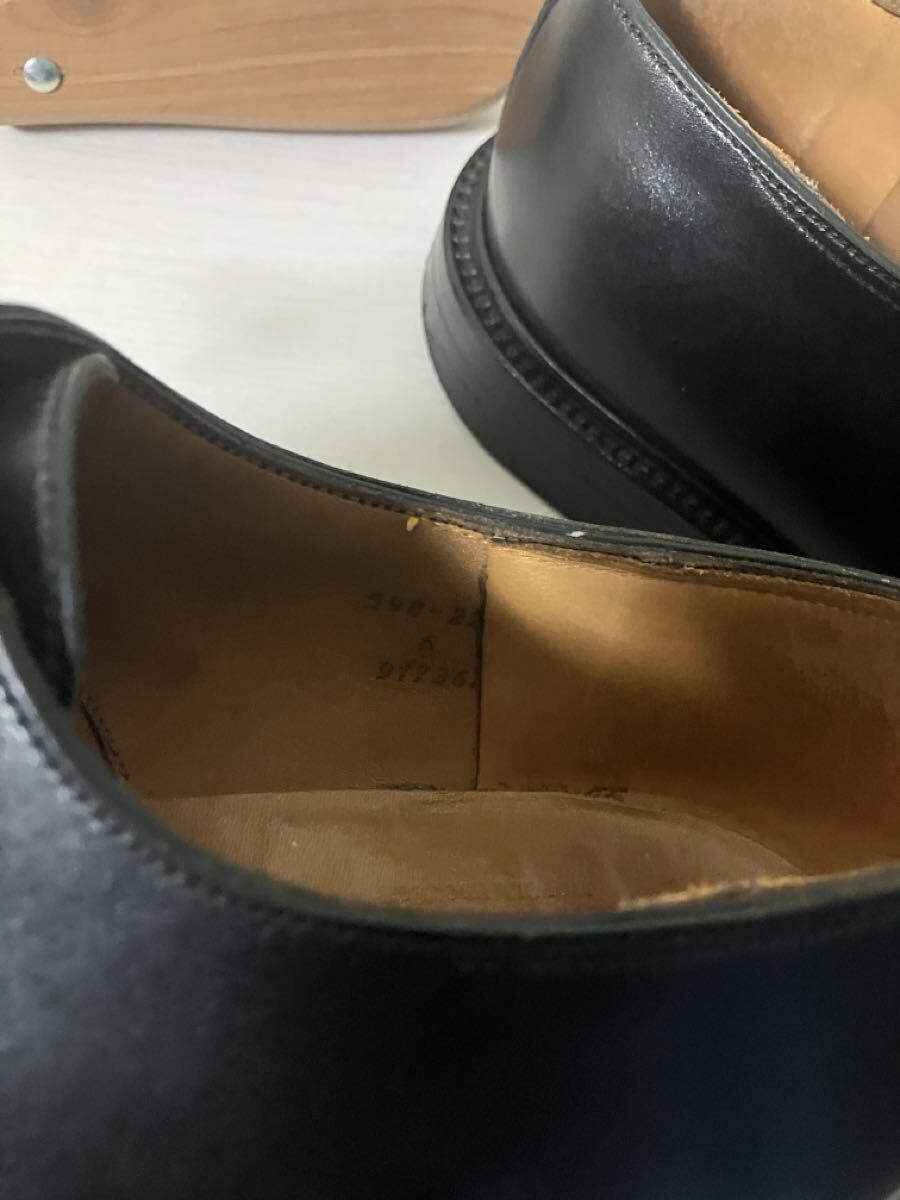 履きジワはさほど深く入っておらず、まだ革の柔らかさも残っておりますので、これからご自身の足型に合わせてエイジングが可能です。ヒール内側をレザー補強しています。光沢感もしっかりあります。