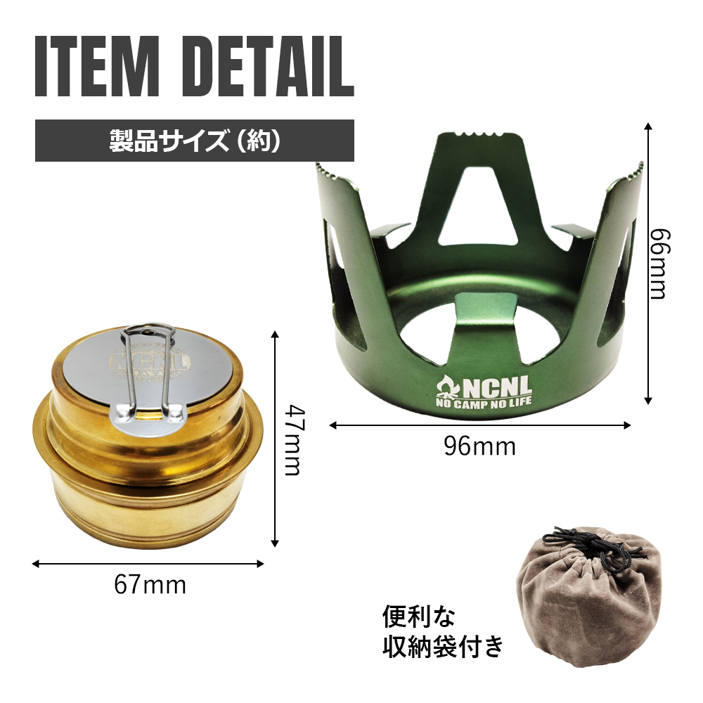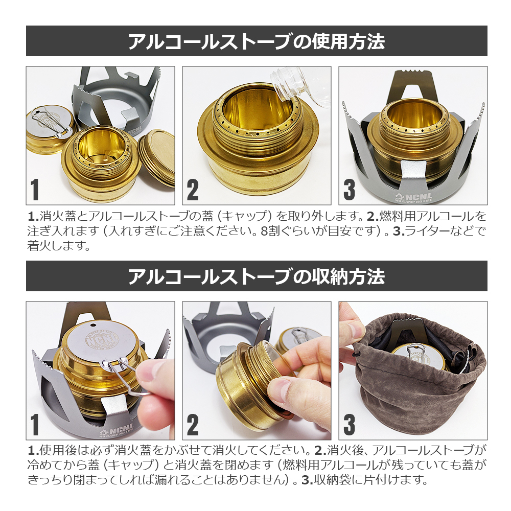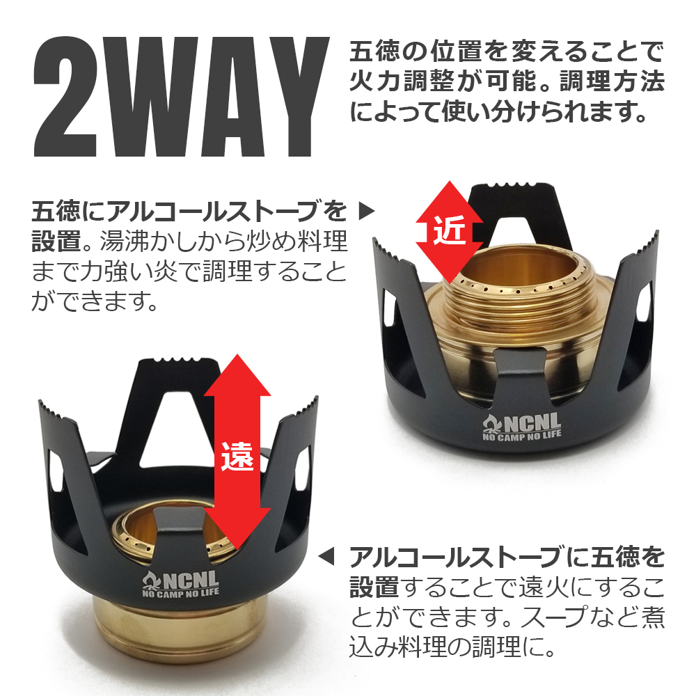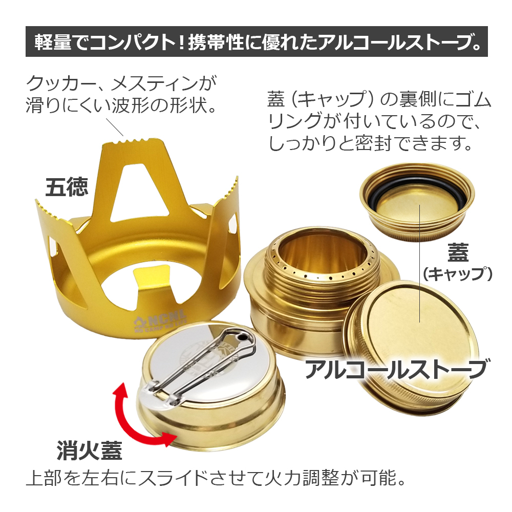 軽量でコンパクトなサイズ感でウルトラライト(UL)キャンプに最適なアルコールストーブ。風防にもなる五徳スタンドと火力調整ができる消火蓋付きなので、これがあれば様々な調理に対応できます。燃料用アルコールを注いでライターなどで着火するだけですぐに使用することができます。