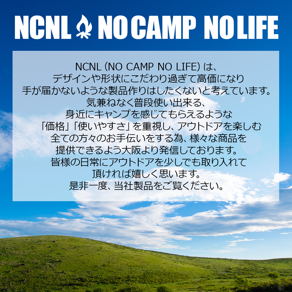 NCNL(NO CAMP NO LIFE)は、デザインや形状にこだわり過ぎて高価になり手が届かないような製品作りはしたくないと考えています。気兼ねなく普段使い出来る、身近にキャンプを感じてもらえるような「価格」「使いやすさ」を重視し、アウトドアを楽しむ全ての方々のお手伝いをする為、様々な商品を提供できるよう大阪より発信しております。