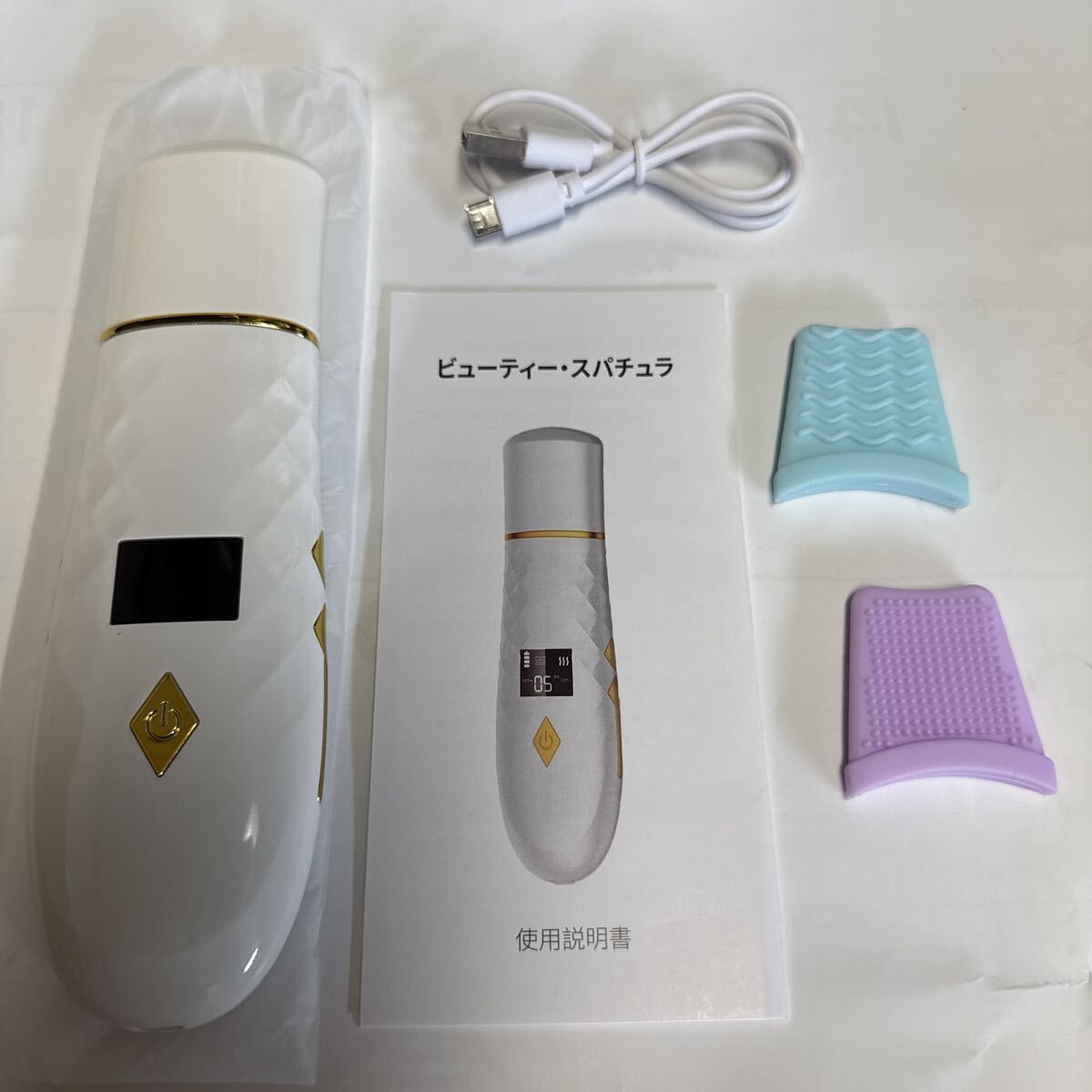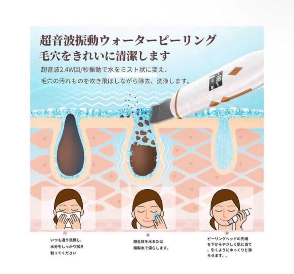 【イオン導出&導入】イオン導出はマイナスイオンに帯電性を利用し、洗顔中に毛穴深層に汚れがプラスの微電流を流すことで吸着します、ウォーターピーリングと振動は導出した汚れを吹き飛ばします。イオン導入はマイナスイオンと振動で美容液とシートマスクの有効成分をお肌の奥深くまでに浸透させます。ウォーターピーリングを使って、手によるパッティングでは届かない部分まで浸透させるので、いつもの美容液の効果が格段にアップします。保湿ハリのある肌へ導きます。保湿ハリのある肌へ導き可能です。