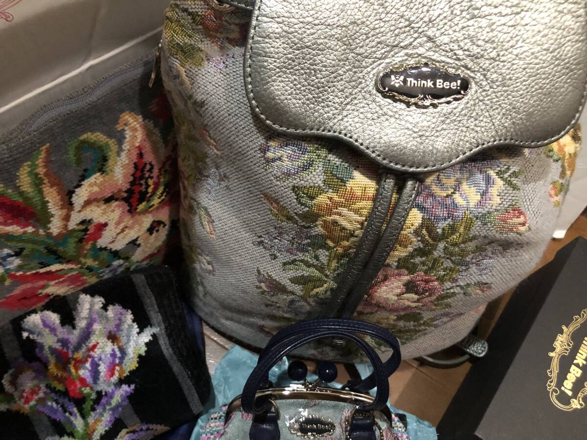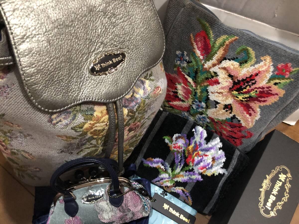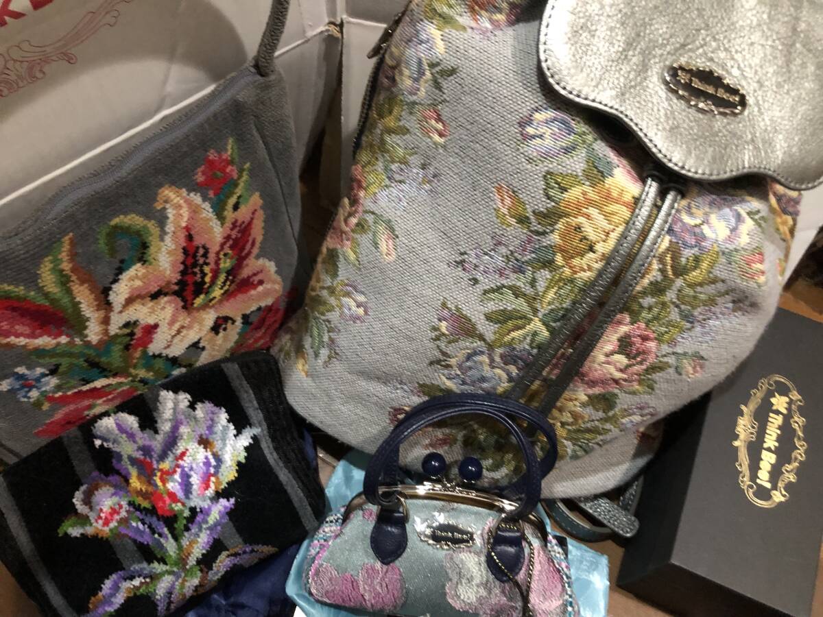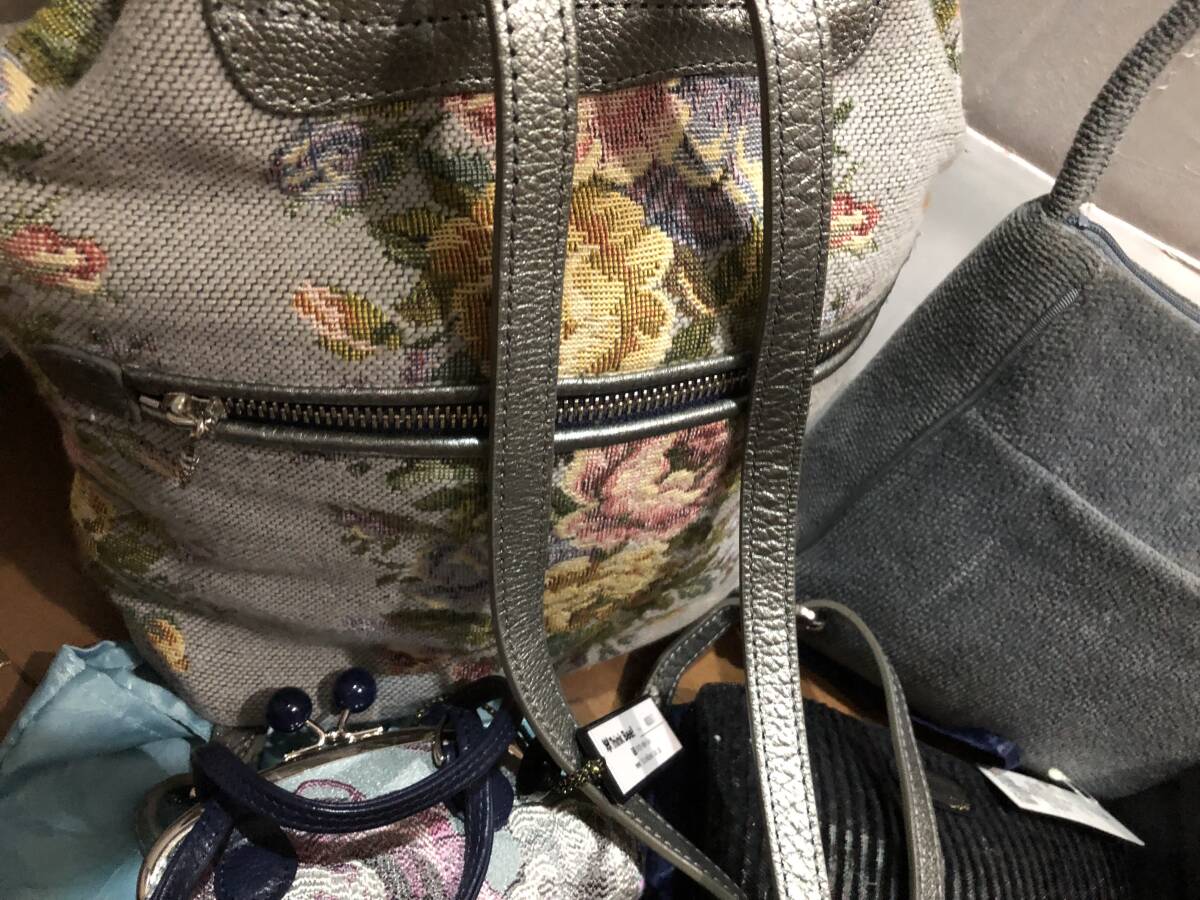 シンクビーとフェイラーの豪華6セットです。希少グレー系花柄リュック1点(牛革ハンドル)、廃盤貴重ノクターンローズ柄がま口ミニポーチ1点、ミニ保存袋2種で2点、フェイラーのグレー系花柄ミニバッグ1点、パープル系のミニポーチ1点の全部で豪華6点です。