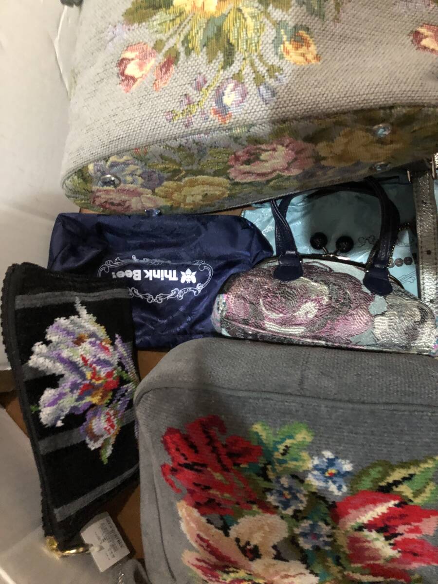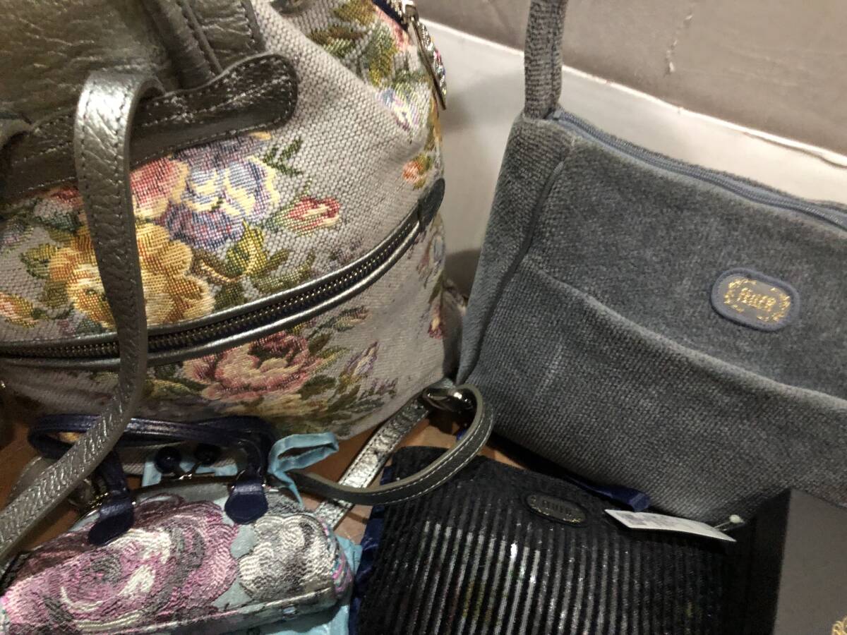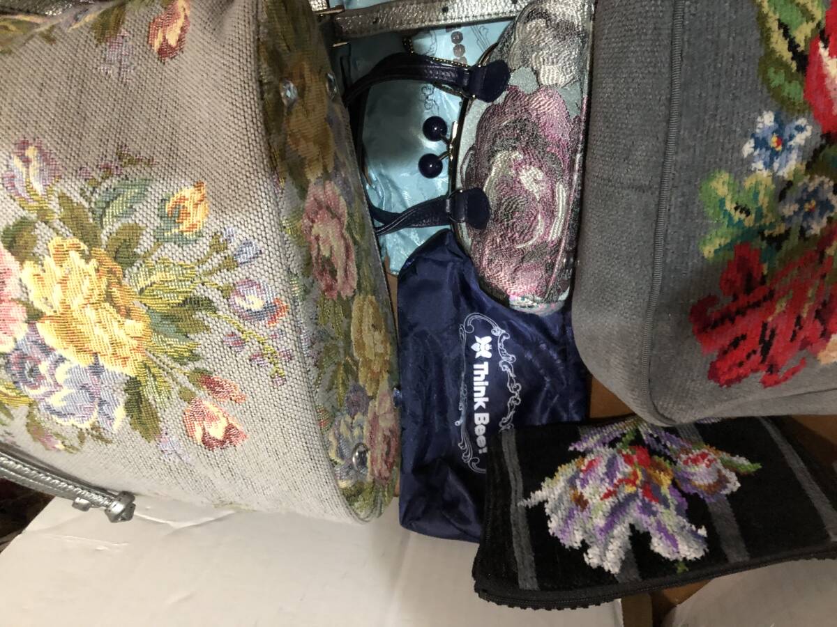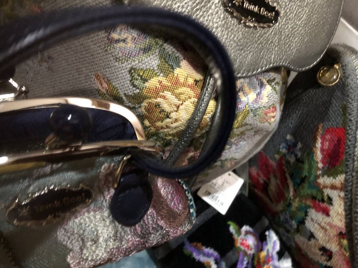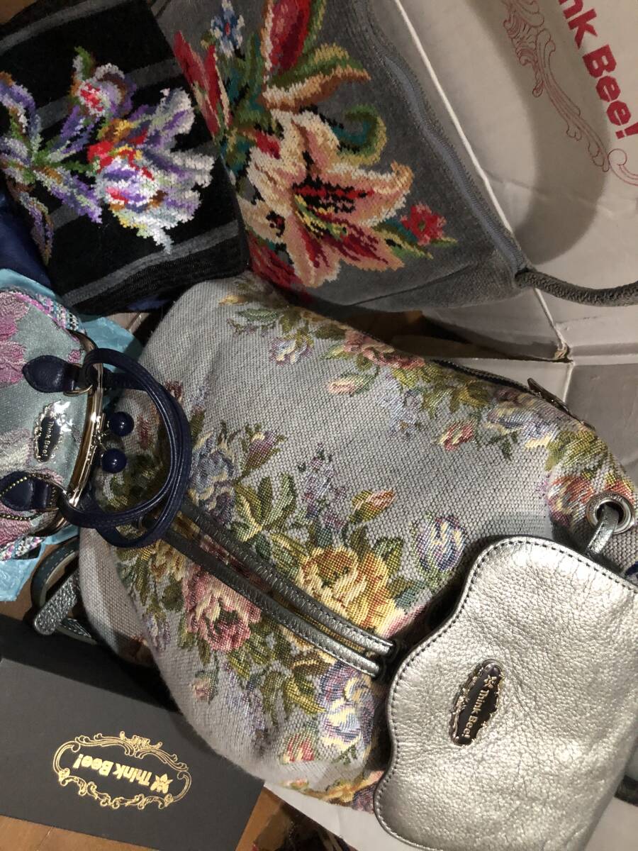 シンクビーとフェイラーの豪華6セットです。希少グレー系花柄リュック1点(牛革ハンドル)、廃盤貴重ノクターンローズ柄がま口ミニポーチ1点、ミニ保存袋2種で2点、フェイラーのグレー系花柄ミニバッグ1点、パープル系のミニポーチ1点の全部で豪華6点です。