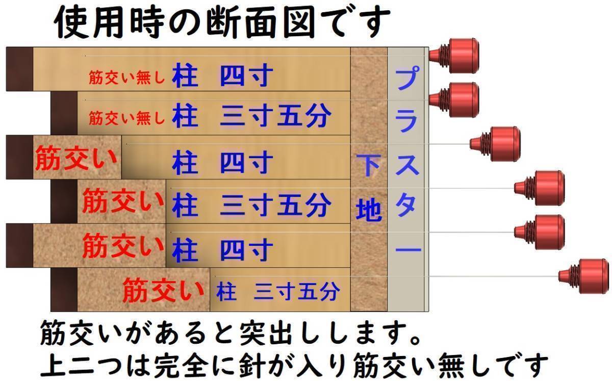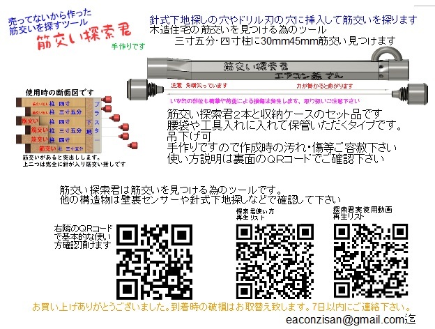 商品説明 | 奥にある筋交いを探るためのツール。 エアコン屋さんが、売ってないので手作りしました。 「筋交い探索君」 「筋交い探索君」 2本組 1つの収納ケースに、筋交い探索君を2本収納しています。 使い方 針式下地探しの穴に挿入して使用します。 針は0.6mm径です。 下地がある場合は、1mm鉄工用ドリルで下地を貫通後、挿入して確認します。 筋交いがある場合、突出してその存在を知らせます。 突出せず、針の部分が完全に入り込む場合は筋交いはありません。 針式下地探しと同様の感覚です。 木造軸組みに対応しています。 土壁には対応できません。 簡易リフォームの住宅には対応できない場合があります。 使い方の説明を動画にまとめています。 よろしければご覧ください。 https://youtu.be/Mk0iVcdnAMw 又、筋交い探索君を使ってエアコン穴を開けている動画もございます。 当初開口予定位置で筋交いを発見、回避の後開口の作業動画です、併せてご覧ください https://youtu.be/6ecmlAYq-Yw コピーアンドペーストでお願いします。 |