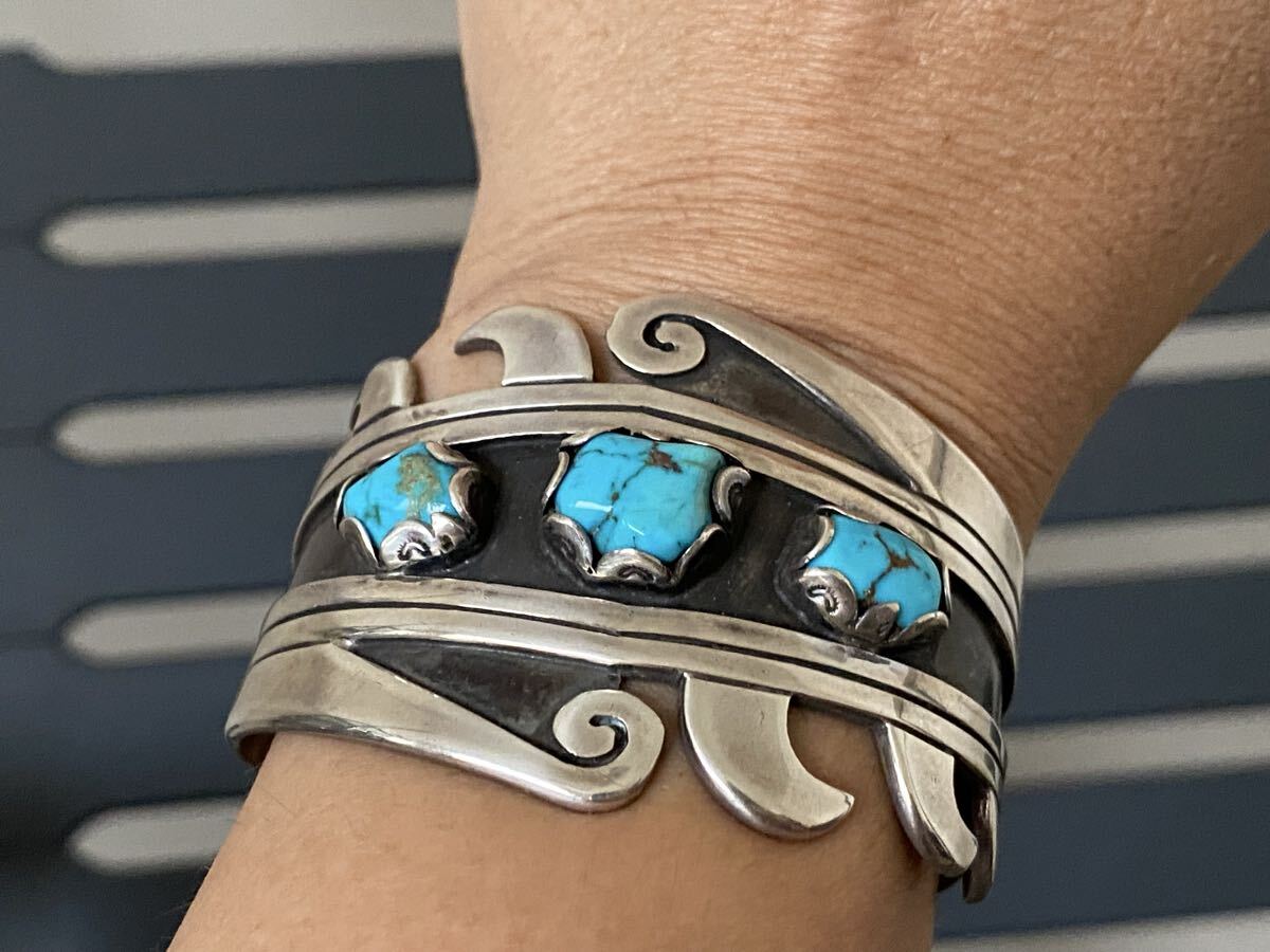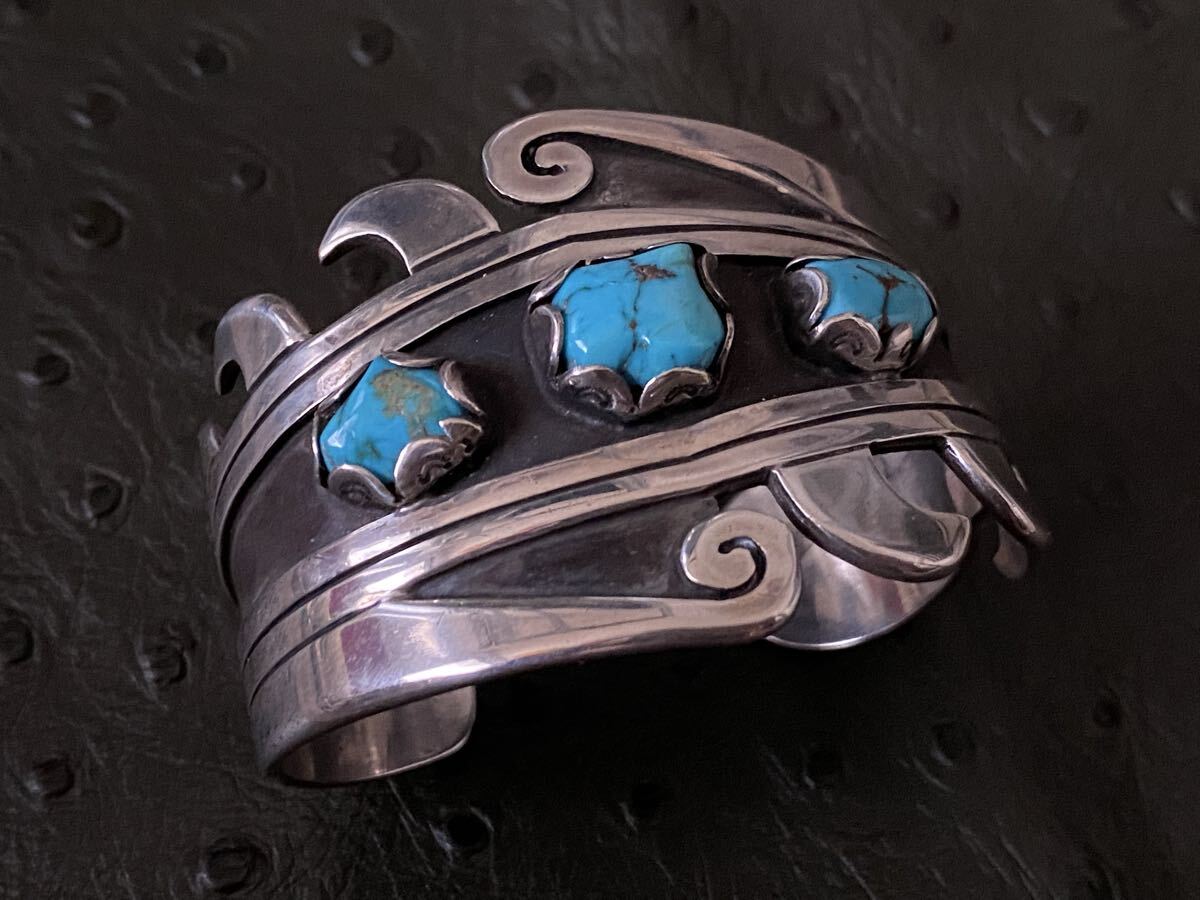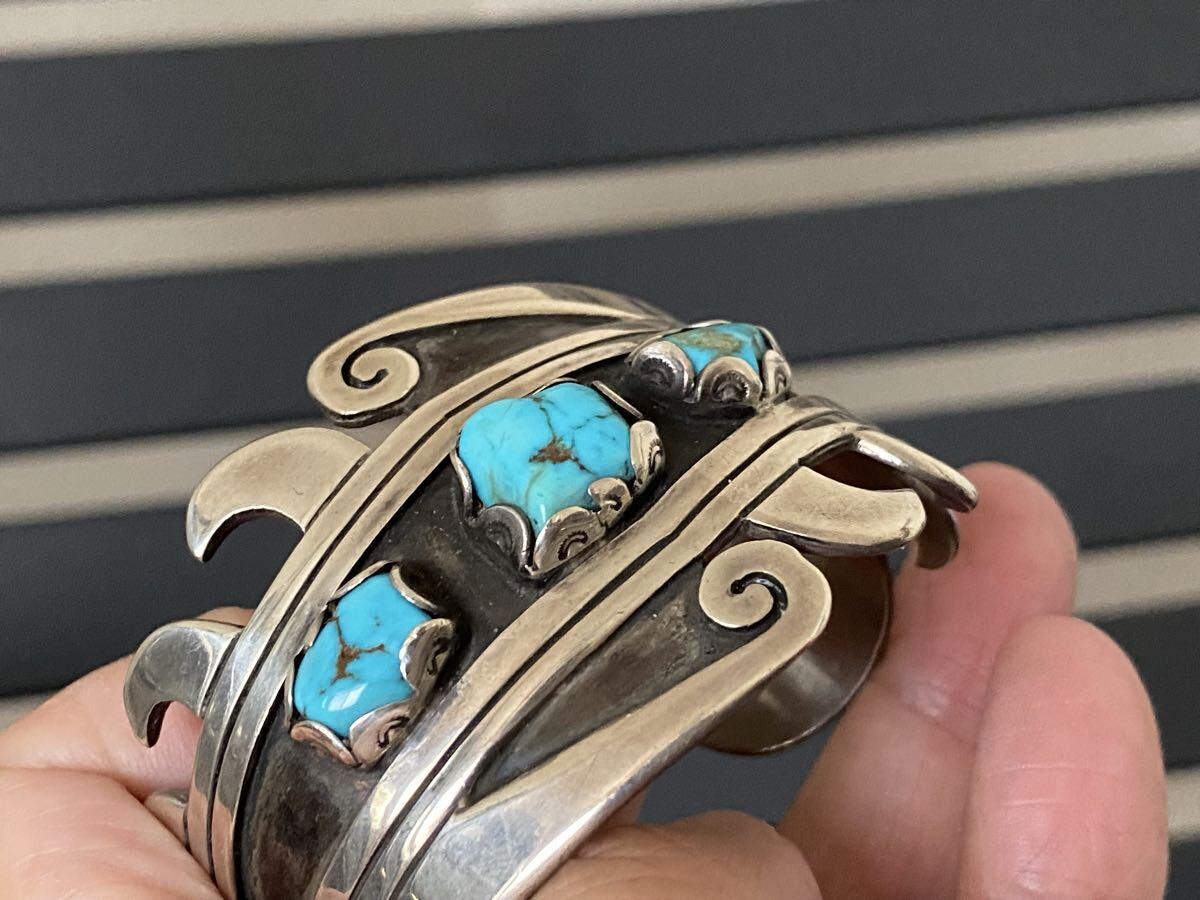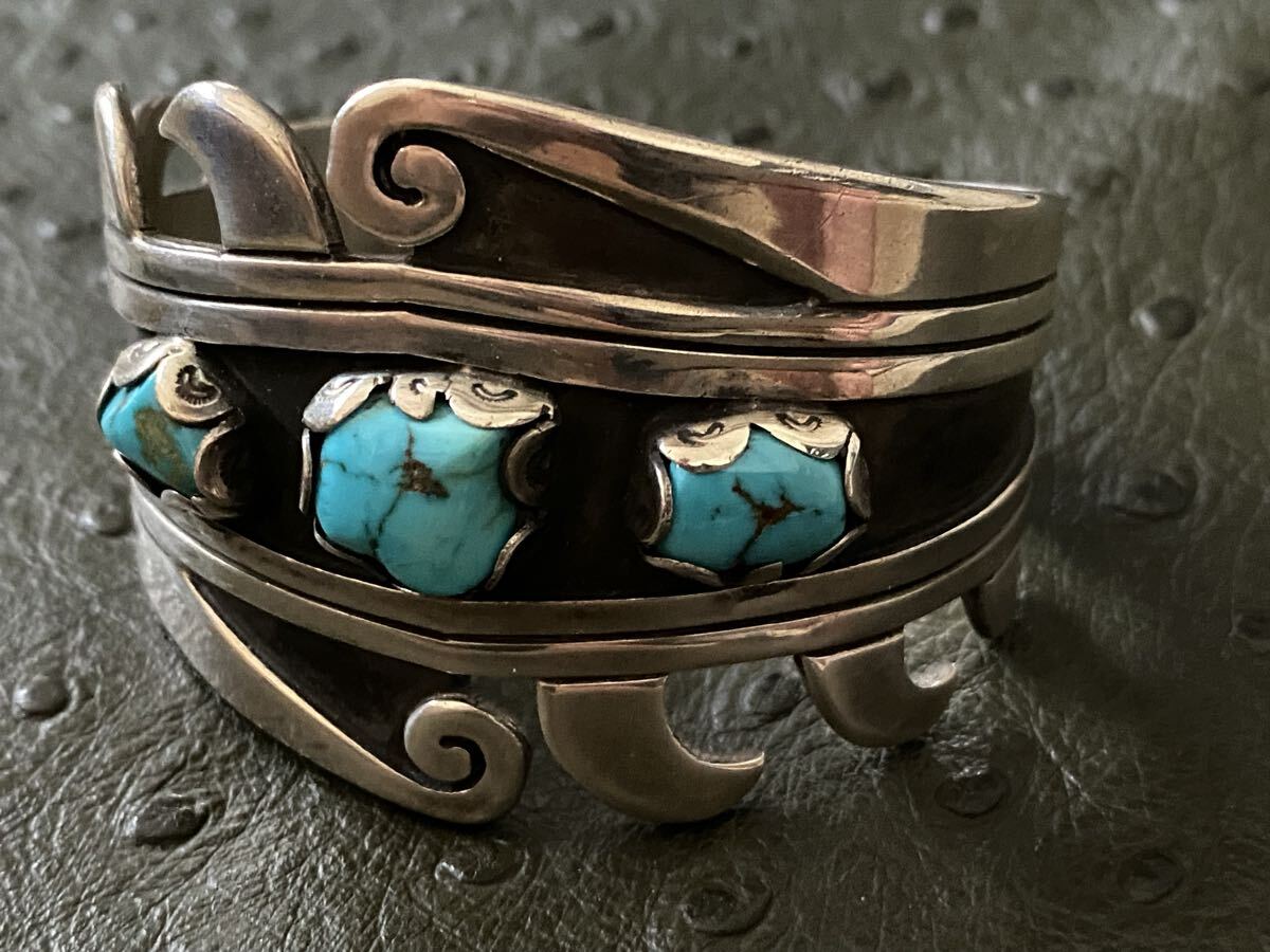 また、シルバー製品すべてに言えることかと思いますが、クスミや小傷があります。気になる方は、ご遠慮いただきたく思います。当方、コレクターであり、購入店及び、コレクターの誰々さんから購入しましたか?いくらで購入しましたか?のご質問には、迷惑が掛かりますので一切お答えいたしません。新旧インディアンジュエリーを相当な数を見て触ってきましたので、放出品には自信があります。