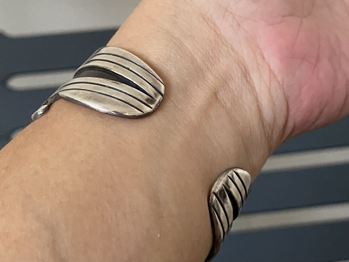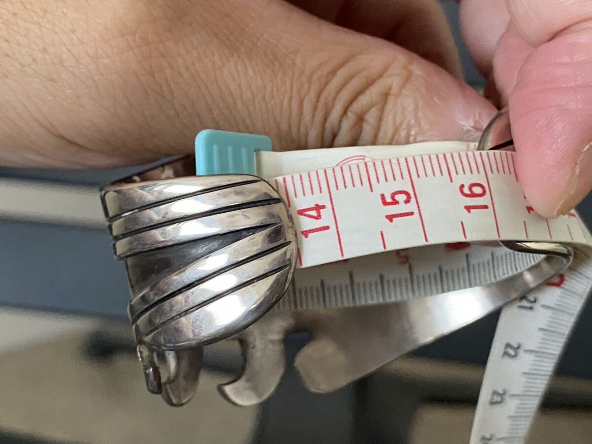 サイズは、銀板部分を一周して、13.5cm。開口部を入れて約16cmです。私は細腕(腕周り約15.5cm)のため、入手後に若干縮め、ジャストです。重さは約64gでずっしりです。