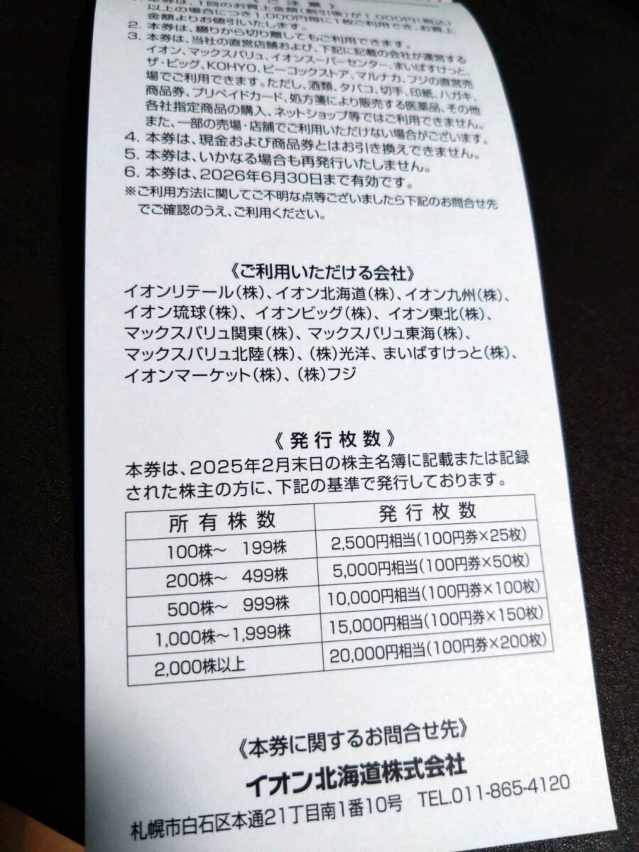 【株主優待券】イオン北海道 1冊(100円券×25枚)<有効期限:2026年6月30日>