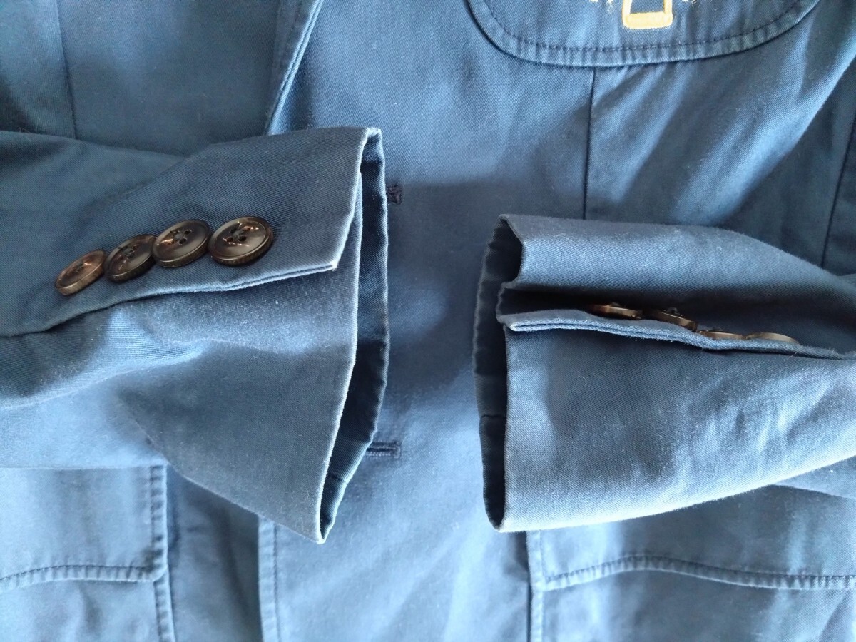 3つボタン段返り、フックベント、パッチポケットの形状と刺繍もアクセントになっています。