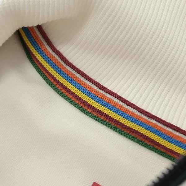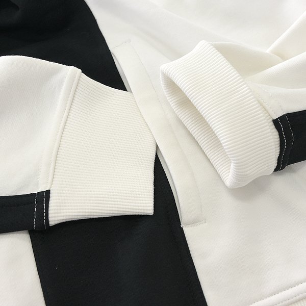 Sサイズ(画像は別サイズで撮影) チェスト80~88 ※商品に記載されたサイズ・寸法です※ 肩幅42cm 身幅50cm 袖丈59cm 着丈63cm ※伸縮性が高い素材のため多少誤差が生じることがあります※ 身生地:綿90% ポリエステル10% リブ部分:綿85% ポリエステル10% ポリウレタン5% ホワイト×ブラック系 |