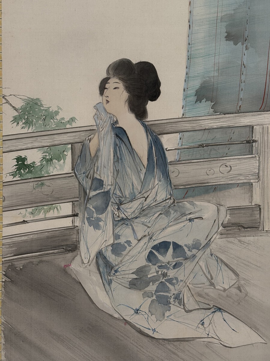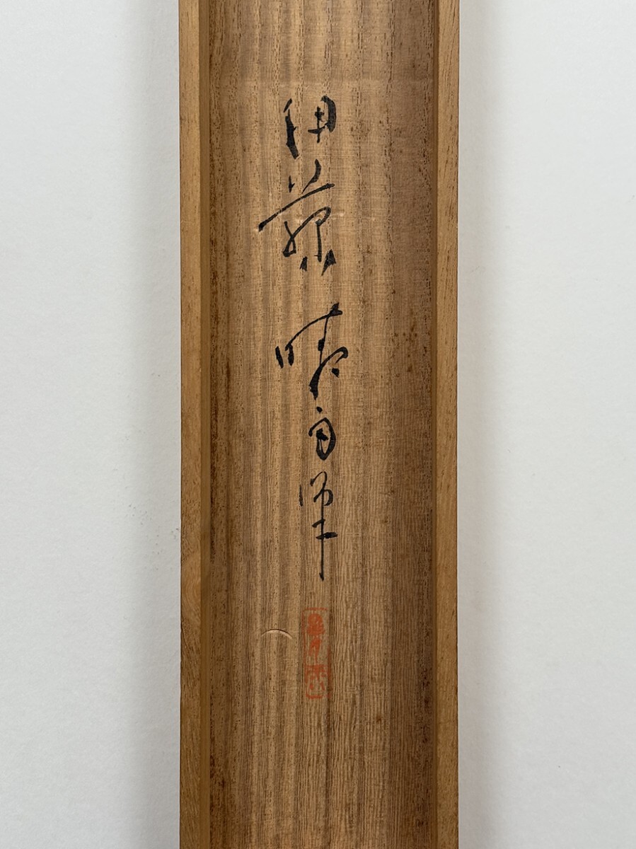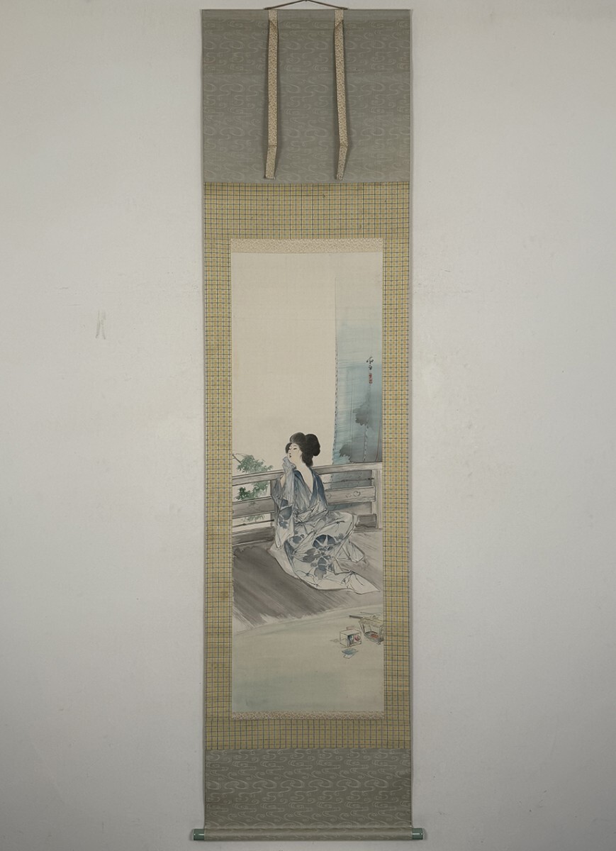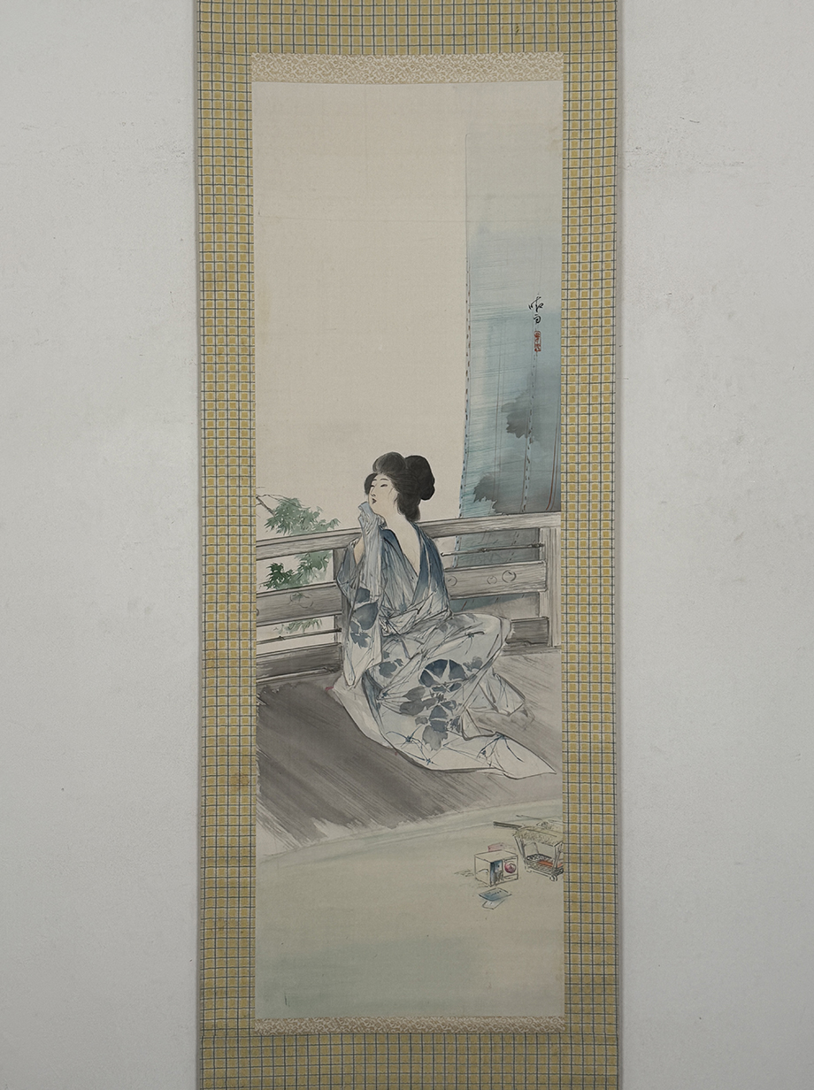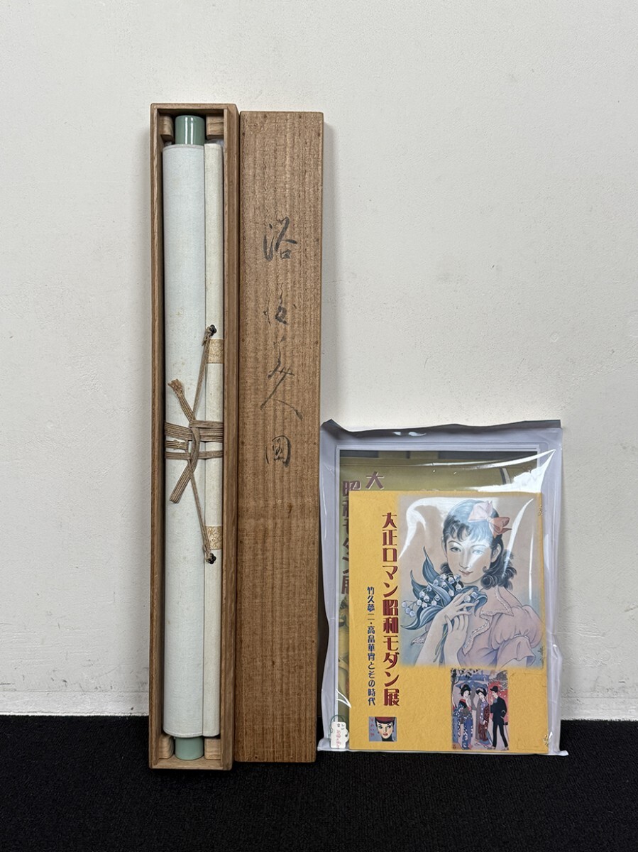 総丈サイズ…横 54.5 × 縦 218.5 cm 絹本着色・共箱 『大正ロマン昭和モダン展』出陳並図録添付 状態…表具微少汚レ 本紙微少シミ 【印刷ではありません】 【真作】 伊藤晴雨 画家。東京浅草生。本名は伊藤一。責め絵、幽霊画を得意とした。幼い頃から絵が得意であったため8歳で琳派の絵師・野沢提雨に弟子入りする。25歳で毎夕新聞に入り、連載講談や連載小説の挿絵を描いた。画家であったが演劇にも情熱を注ぎ、また明治から大正の風俗の研究にも力を注いだ。昭和36年(1961)歿。 |