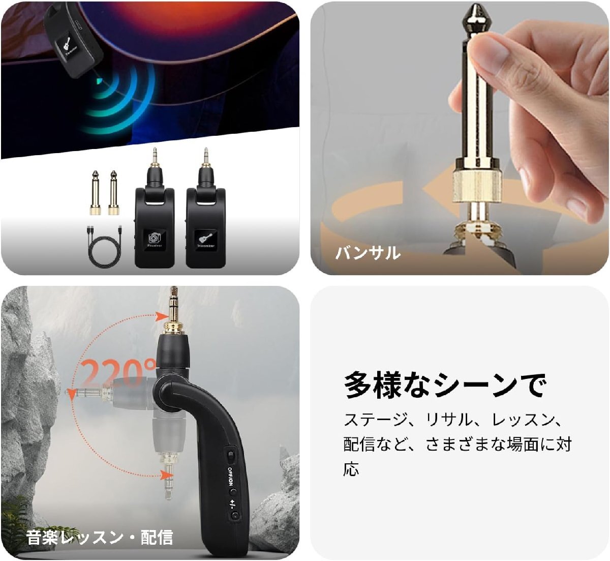 【便利な充電】: ギターシステムの送信機と受信機は回転可能なデザイン (220°) と Type C 充電を備えており、さらに便利です。