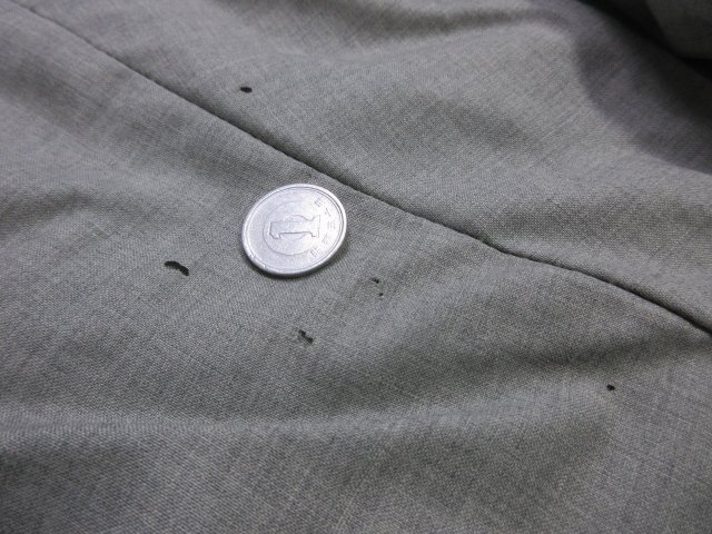 ・多少の着用感、多少のスレ、全体的に生地の浮き、ジャケット袖口裏地に薄いシミ汚れ、ラペル裏地部分一部ホツレ、右胸付近に約3ミリ程、スラックス所々に約1ミリから約6ミリ程の虫食い穴がございます。ご理解の上ご購入下さい。